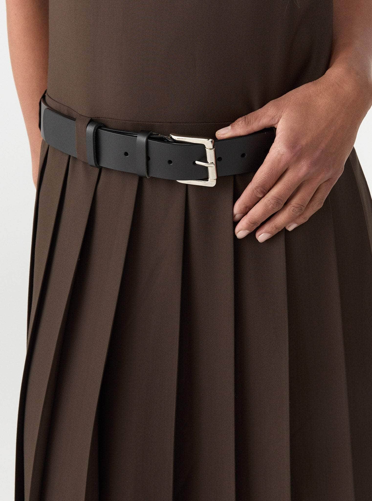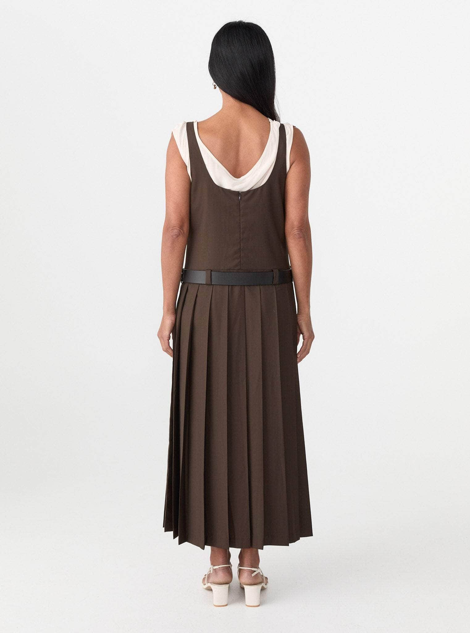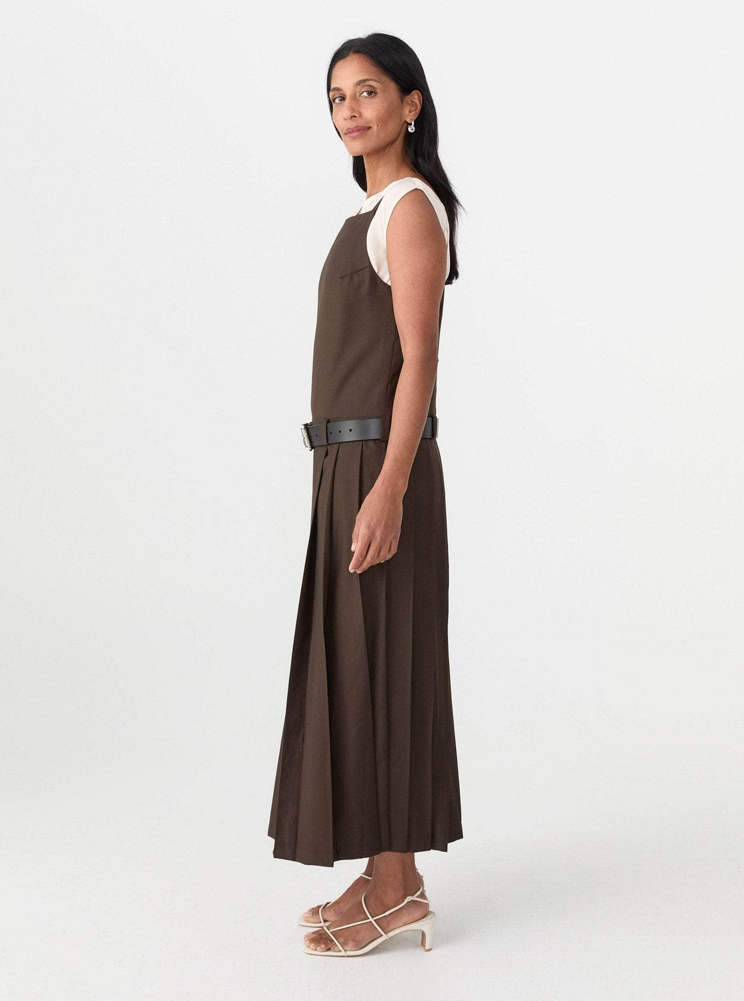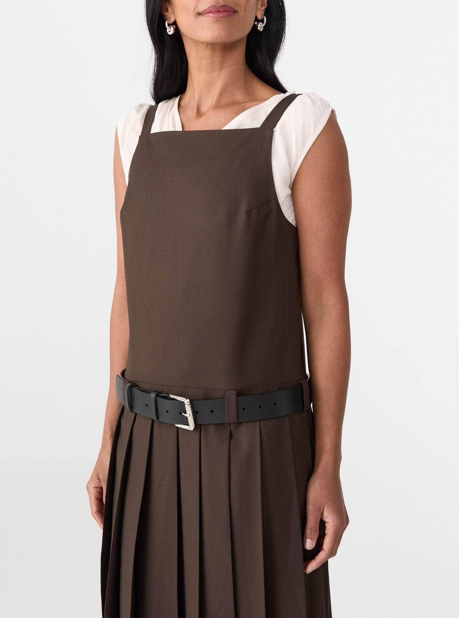 The Alicja Midi Dress is crafted from a warm, structured Wool, Viscose blend, the silhouette features a sharp square neckline and a full, box pleated skirt. A detachable leather belt sits low at the waist.