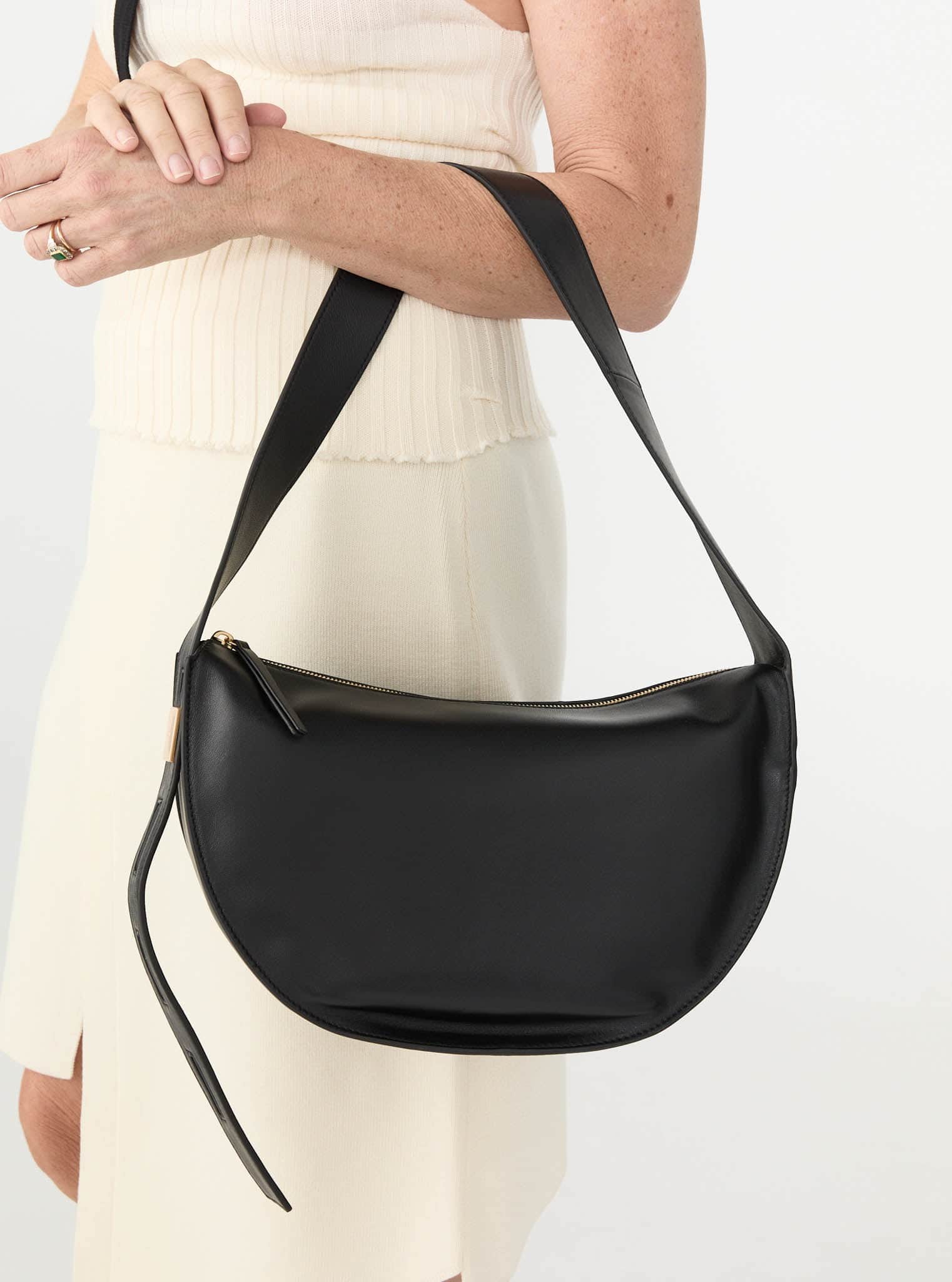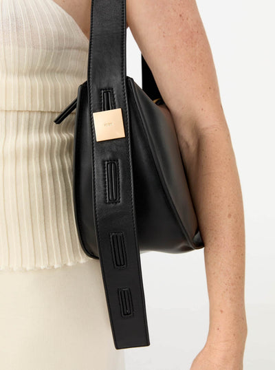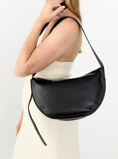 Crafted in buttery-soft lambskin, this bag can be worn crossbody for daytime, or tighten the strap for a sleek little shoulder bag. Spacious, sculptural, and polished.