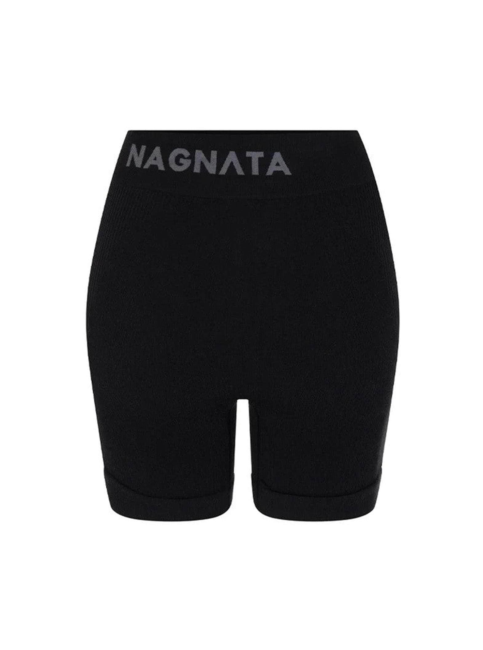 Superfine high-waisted Merino wool mini short. Crafted in the signature Nagnata seamless rib knit, offering mild compression, support and breathability. This style features a double layer waistband with contrasting logo on the front and back.