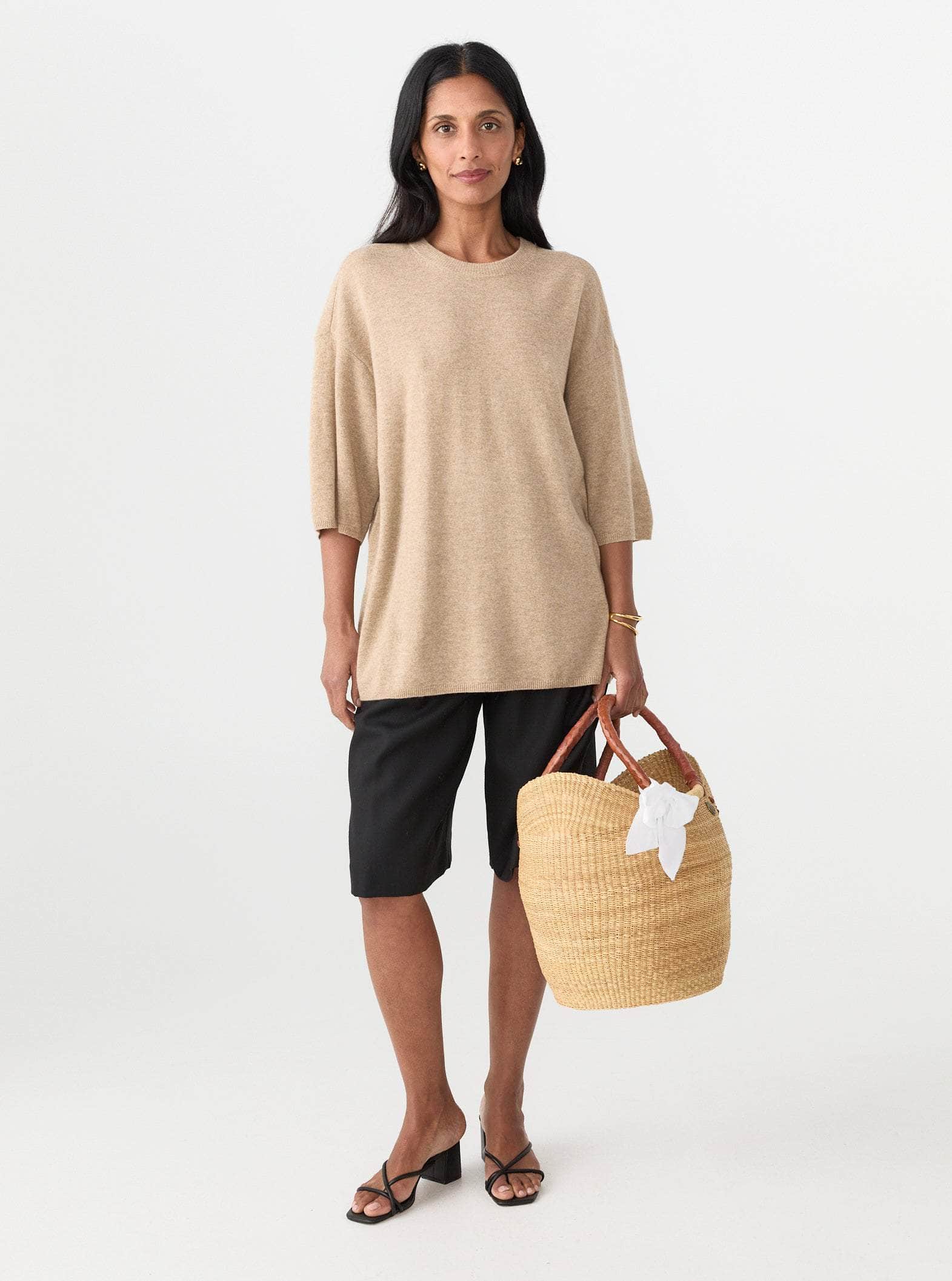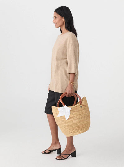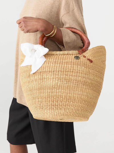 Handwoven by skilled artisans in Ghana who have perfected their craft through generations, the Basket Bag is a cute and practical addition to your accessories roster. It’s been woven from elephant grass, which has been ethically sourced from the low-lying flood plains around Bolgatanga in northern Ghana. It’s finished with leather-wrapped handles, a bow embellishment and the label’s motif.
