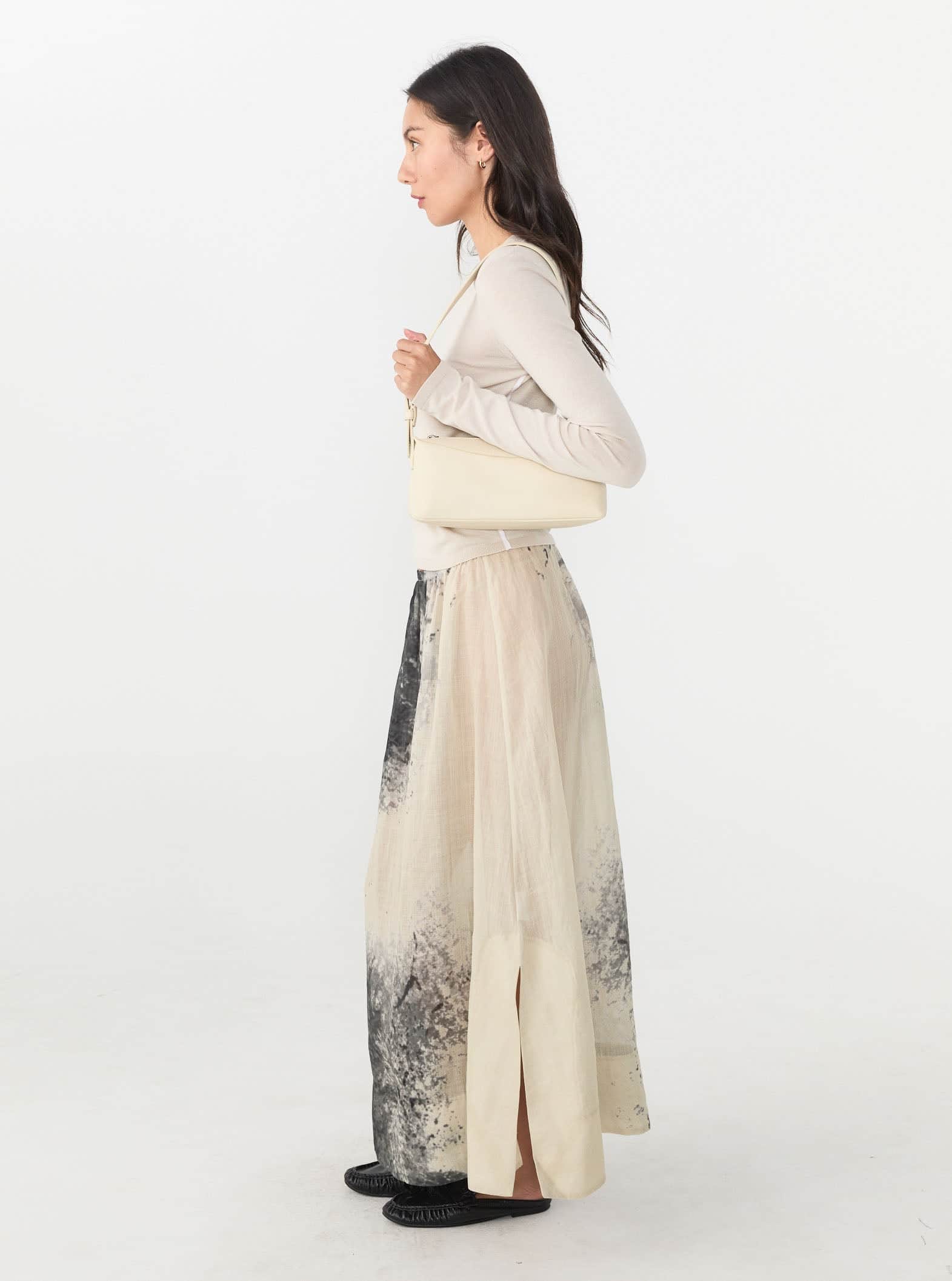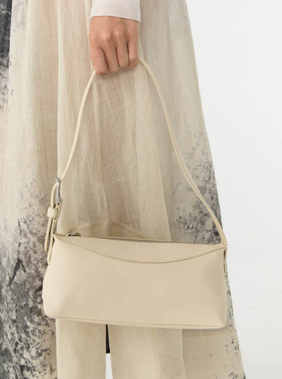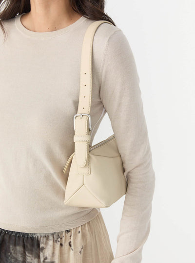 Crafted in soft cream lambskin, the Bobby Bag is a unique baguette style that works belt detailing through a semi-rectangular, slouchy shape. It features Yu Mei signature triangle panels, hand-tack detailing, and custom chrome hardware.