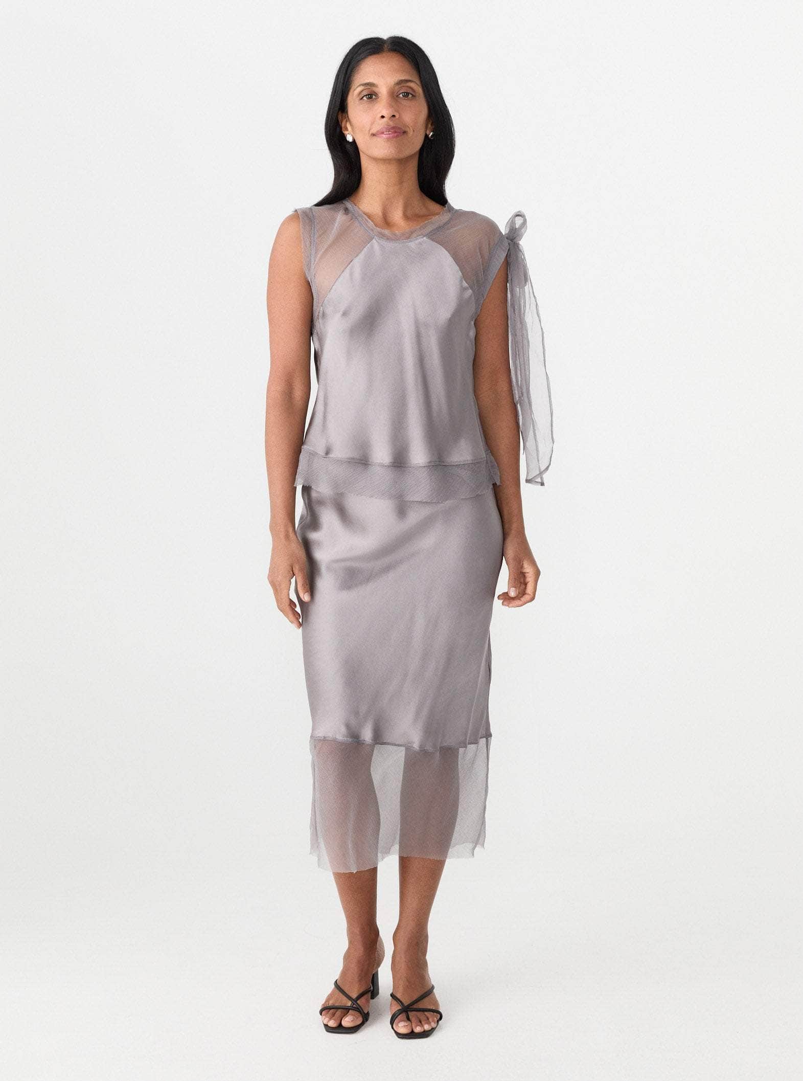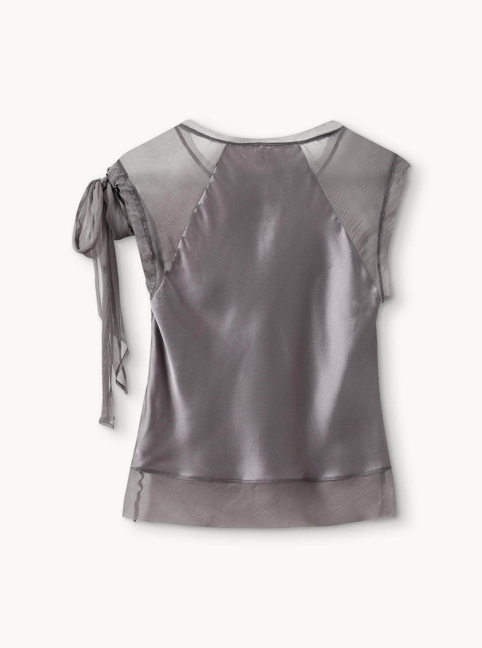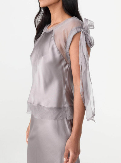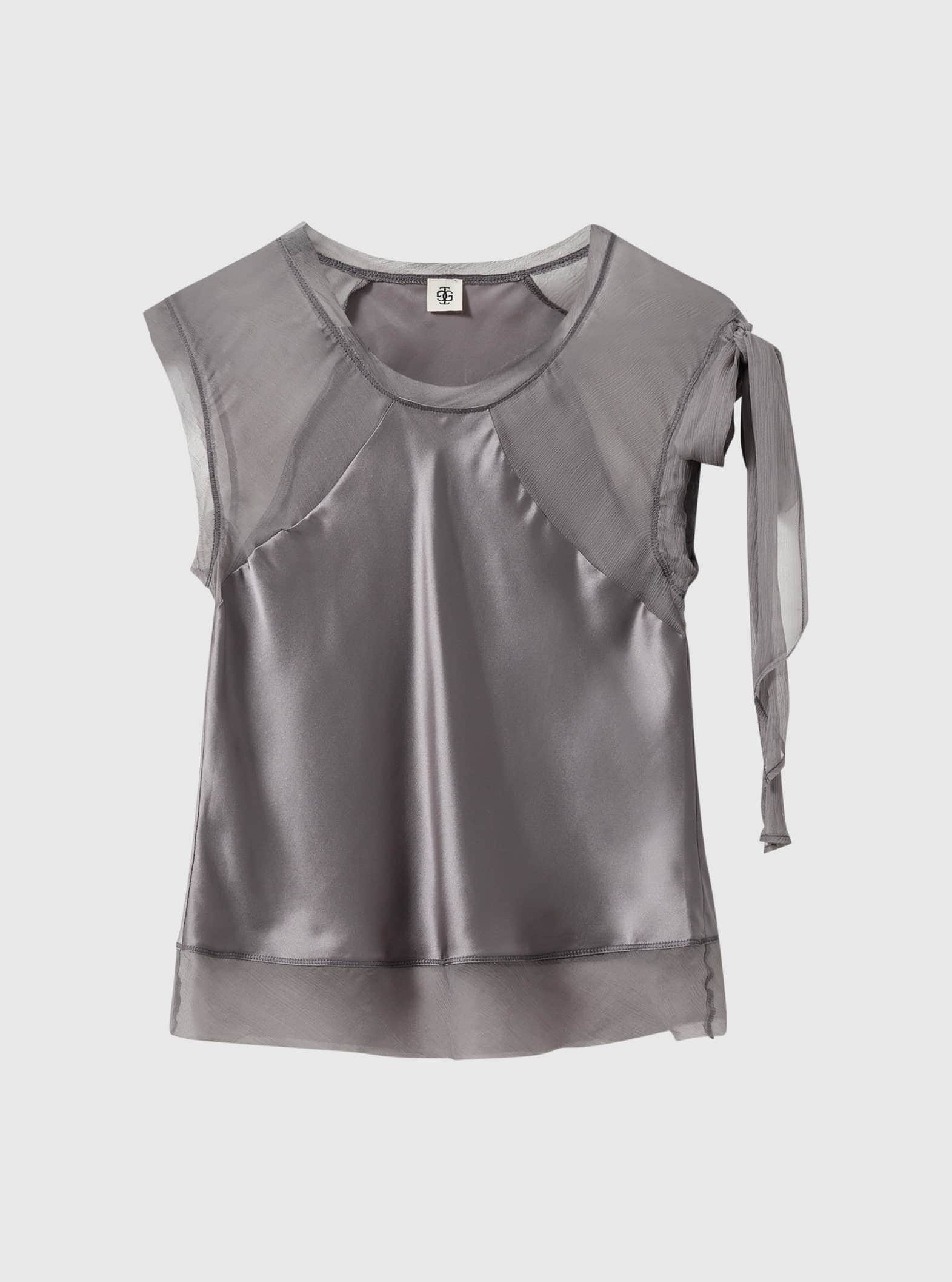 The Garment Catania Blouse is crafted from 100% Silk in a smoke grey hue with sheer contrast panelling to add dimension, while delicate tie detailing from the left shoulder adds dimension and movement. Can be styled with tailored trousers or worn as a set with the coordinating Catania Skirt.