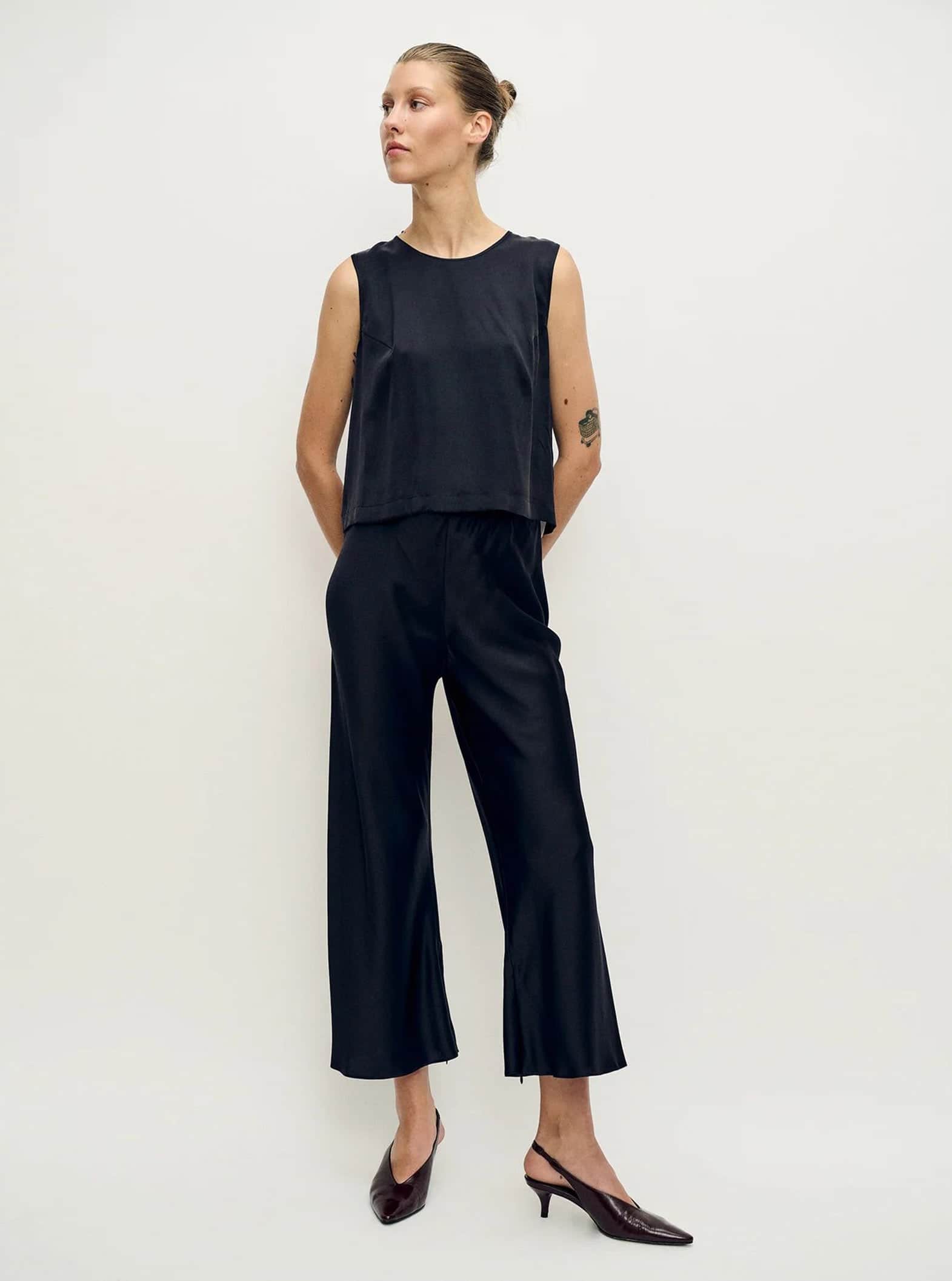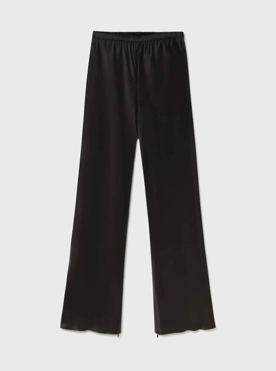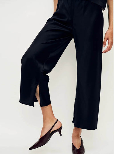 A relaxed pull-on style, re-imagined this season in a cropped silhouette. Crafted from 100% silk satin with invisible zips on the inner hems for styling versatility. Featuring an elasticated waistband and a flowy, wide-leg fit, complete with internal french-seam finishings.