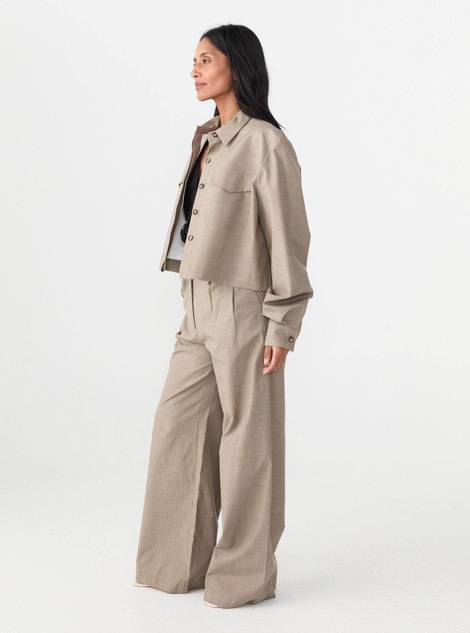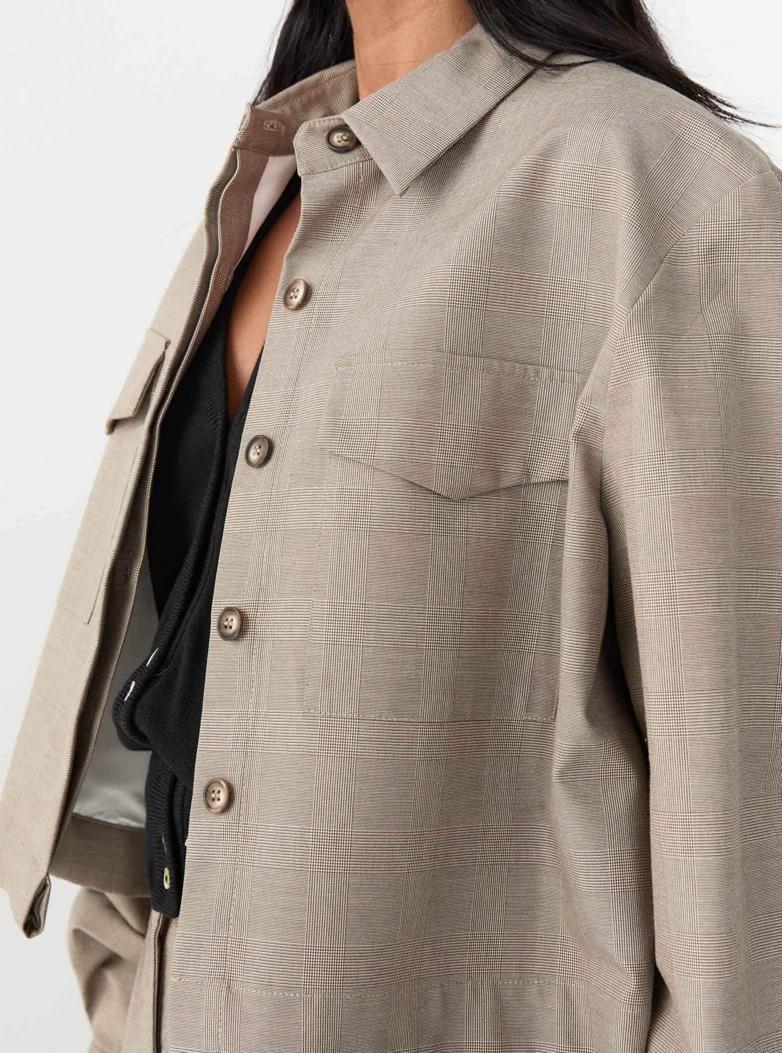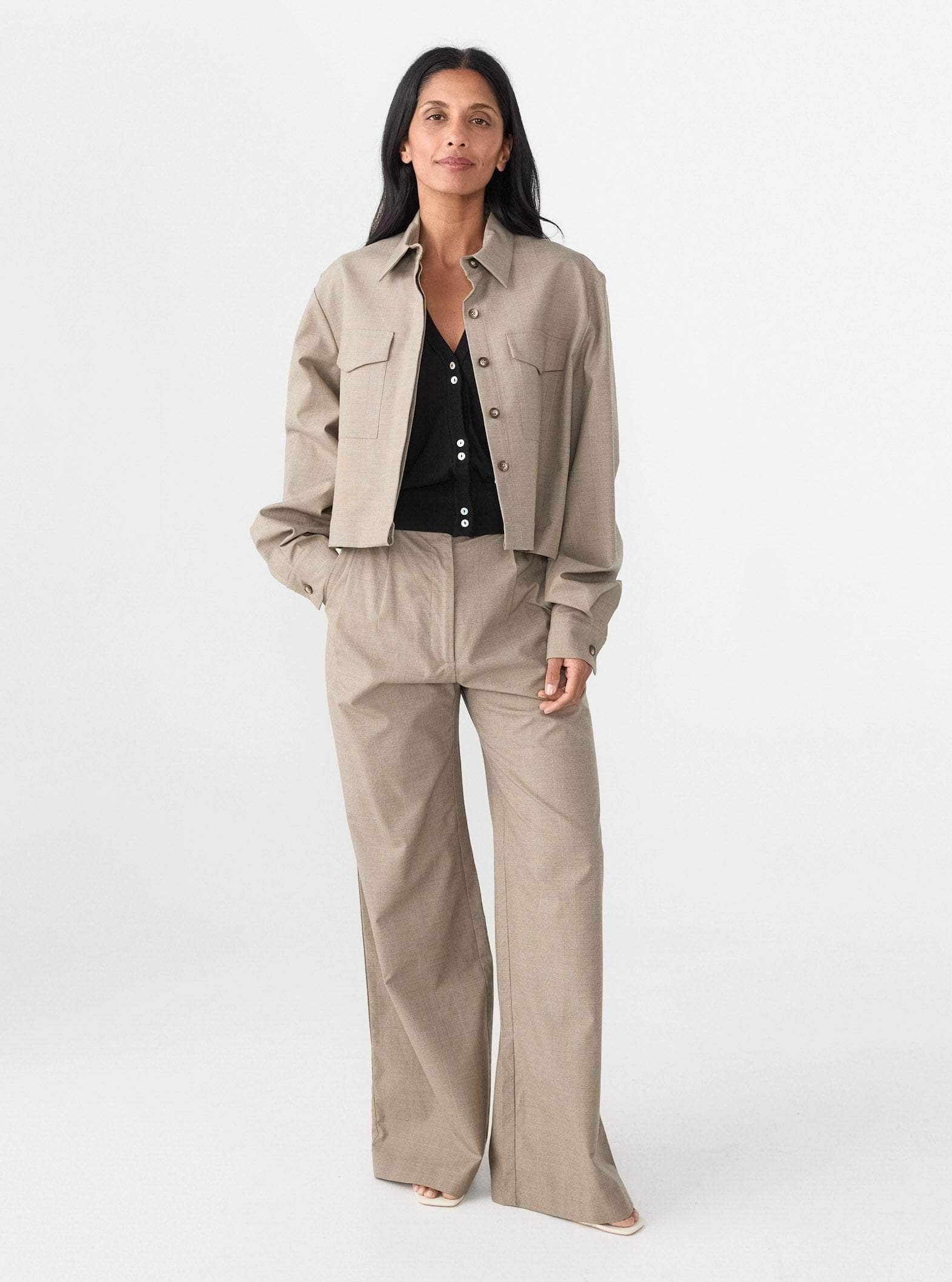 A modern take on classic tailoring by Matin, the Cropped Pocket Jacket in Beige Check blends structured design with effortless wearability. The clean-cut silhouette features a sharp collar, long sleeves with buttoned cuffs, and a cropped length that pairs seamlessly with high-waisted styles. Dual flap pockets on the front add a utilitarian touch, while the concealed button placket ensures a sleek finish. Designed for versatility, this piece can be worn as a lightweight outer layer or as a statement separate for a polished, contemporary look.