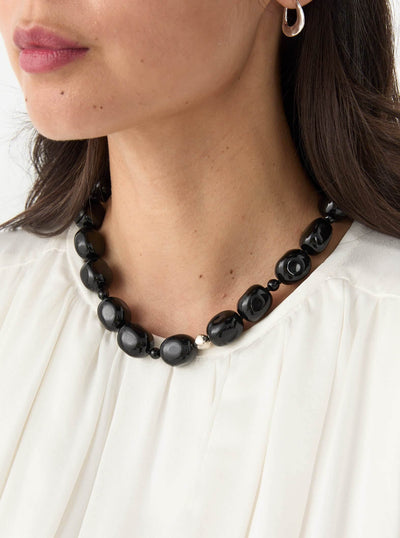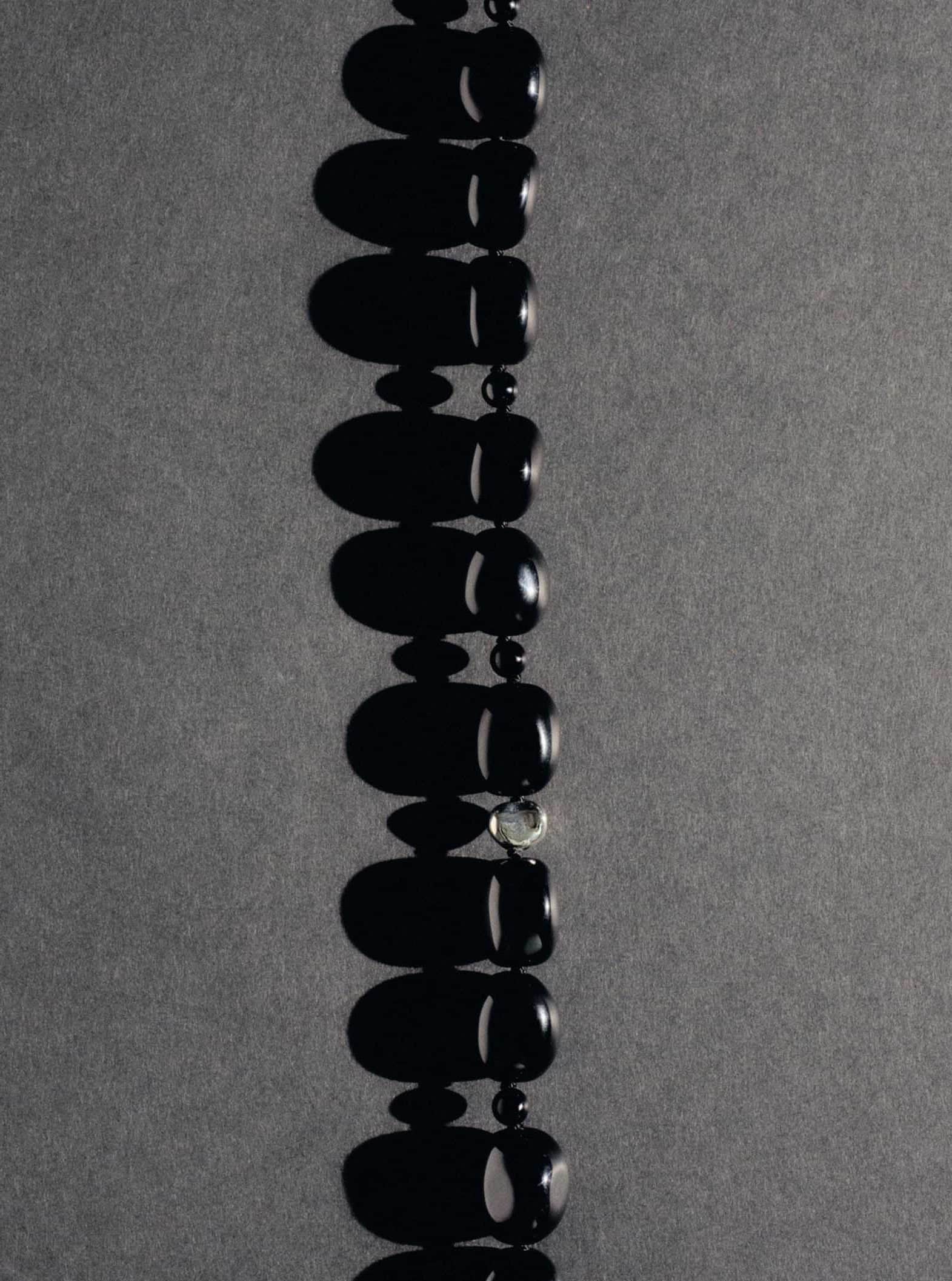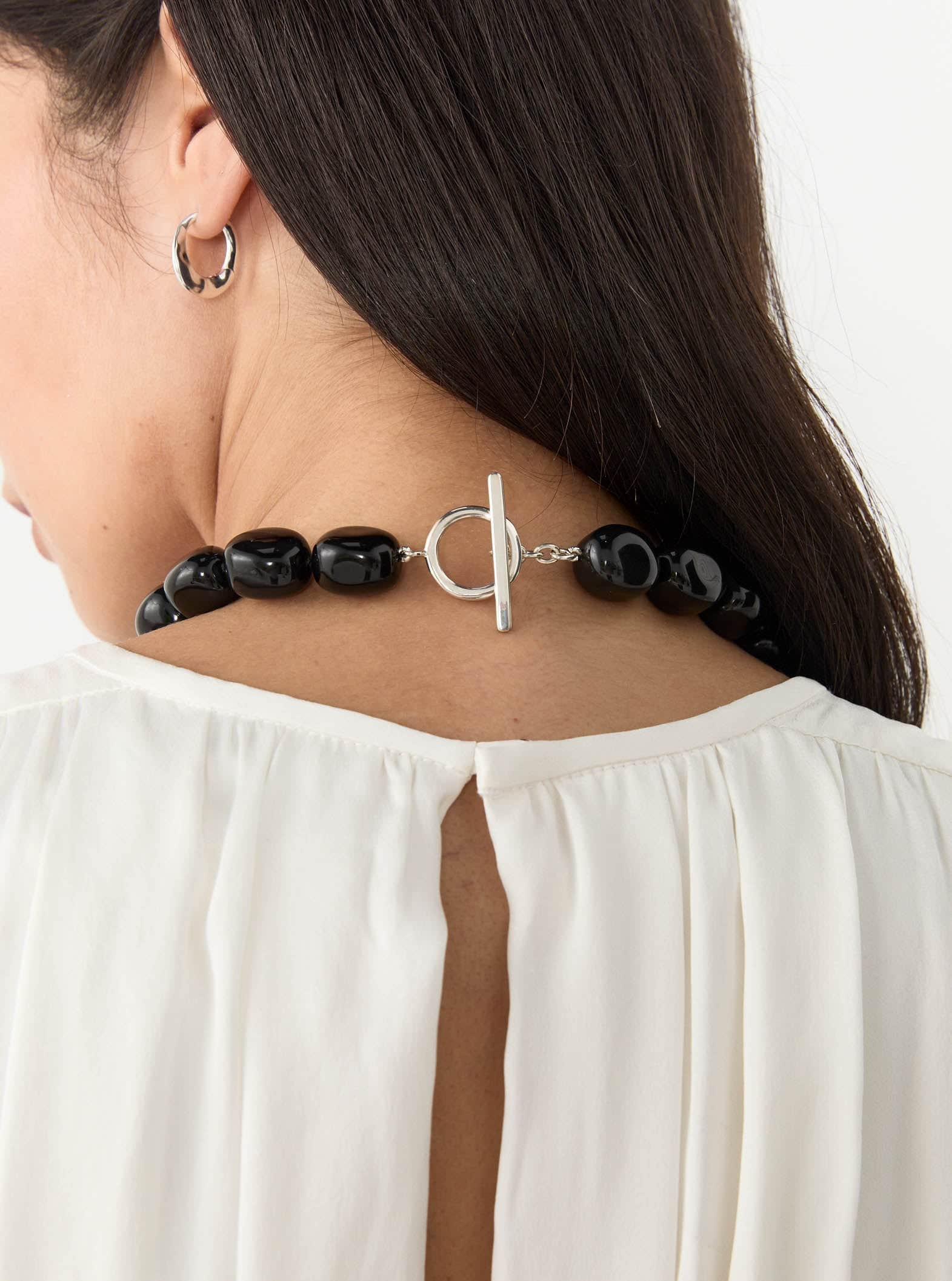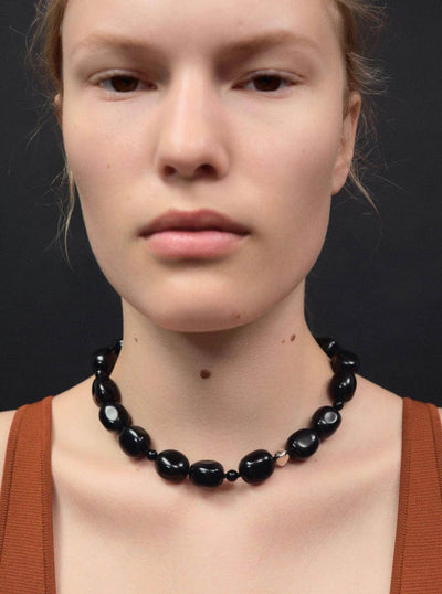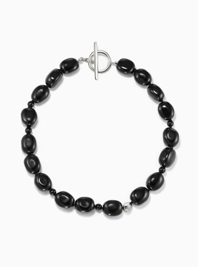 The Dara Necklace is made from Onyx, a natural stone often associated with grounding, protection, and strength. The black stones act as shadow and anchor against the reflective softness of a single sterling silver bead and fastenings. The necklace is secured with a T-bar closure, sitting at the collarbone.