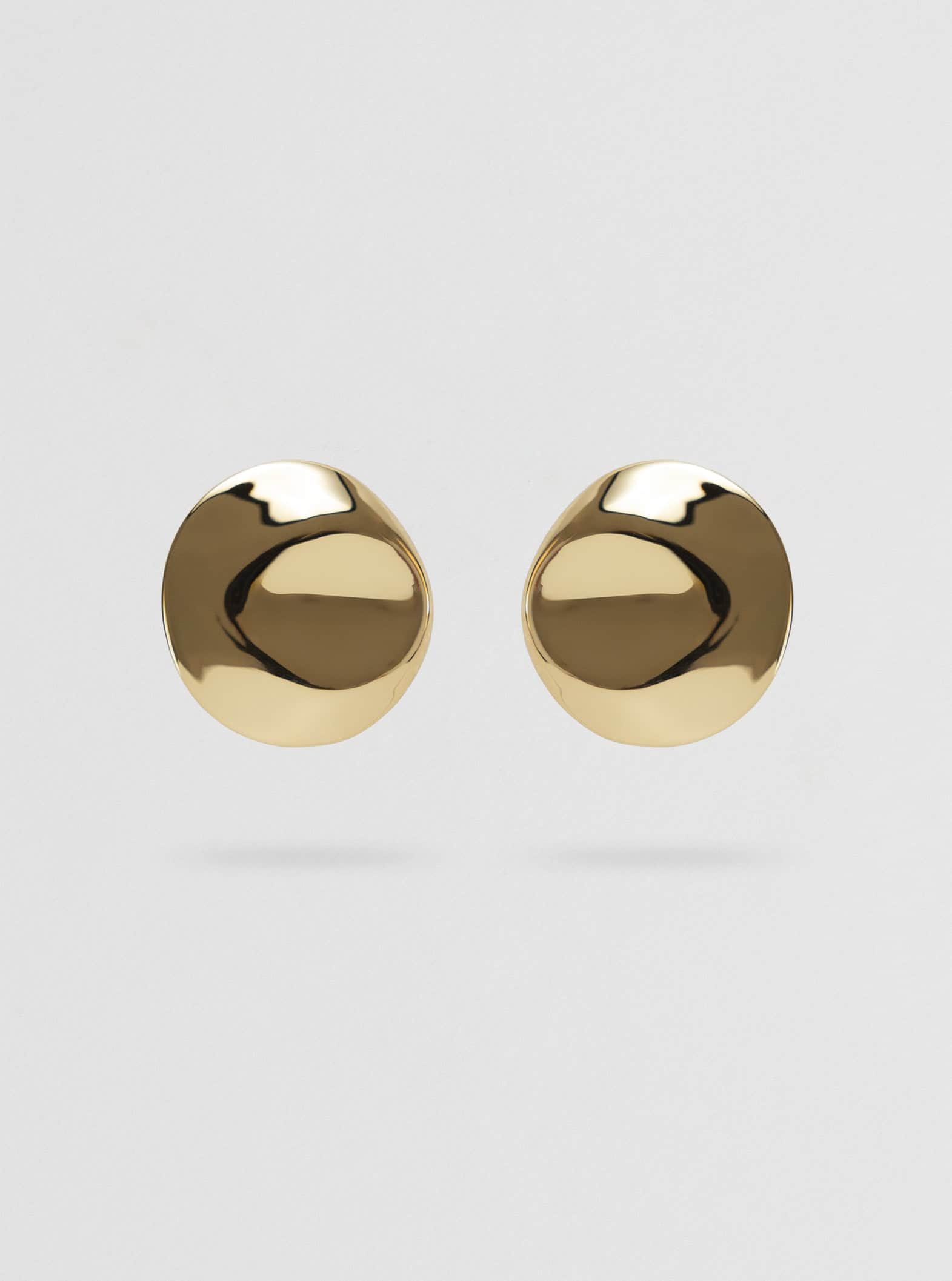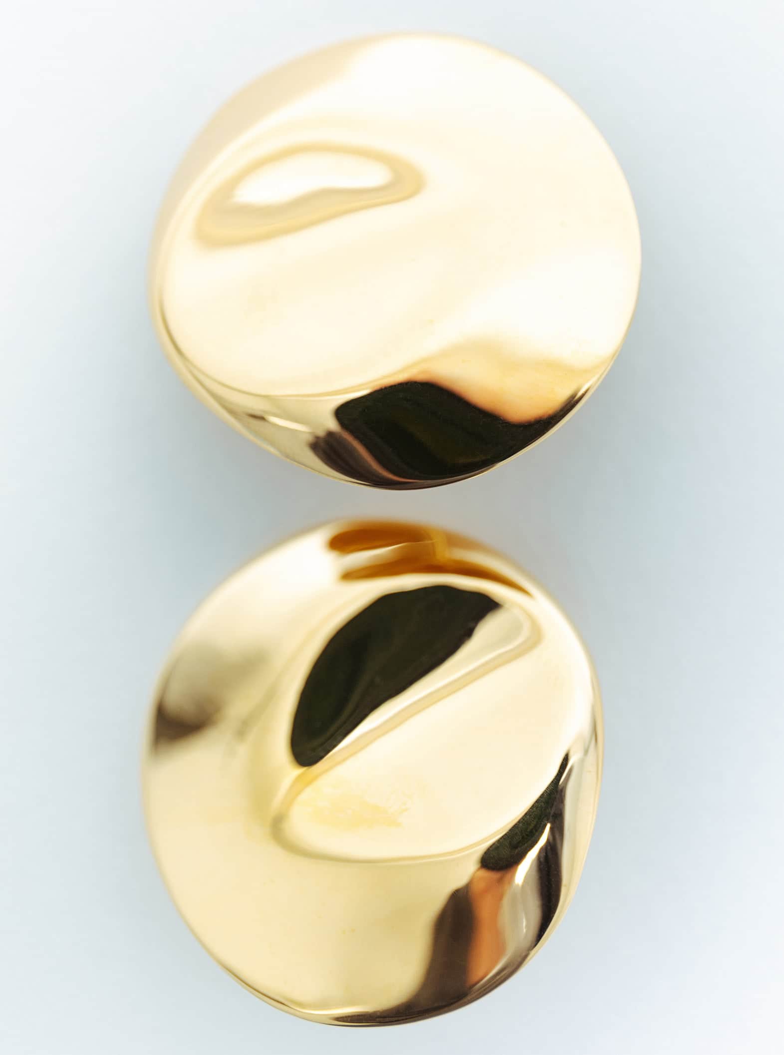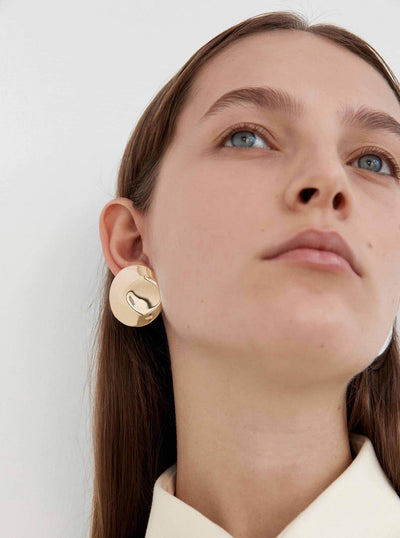 A lightweight statement earring with deliberate dented imperfection. Mirror Finish. Wear on any occasion—or casually with jeans and a t-shirt.