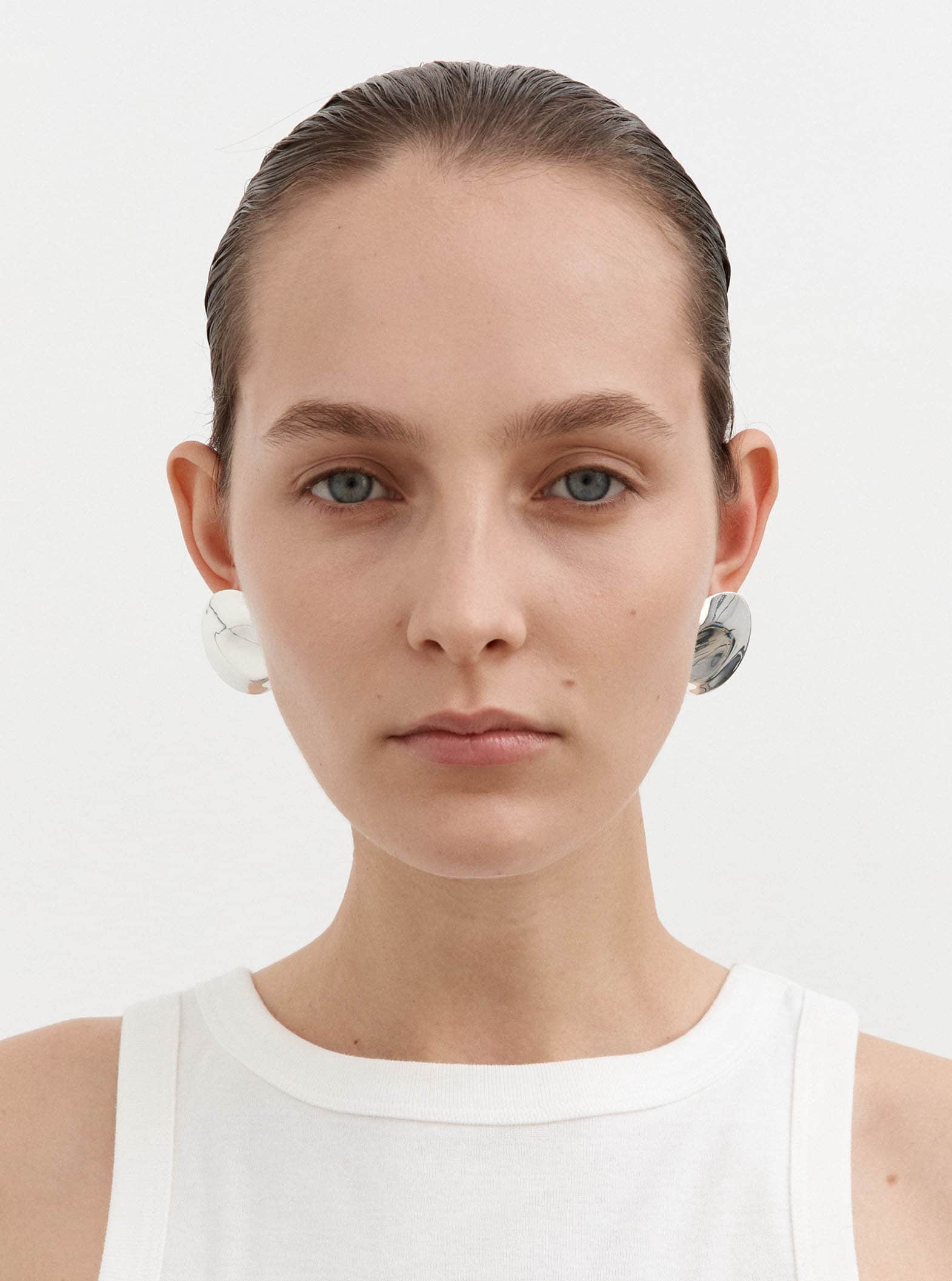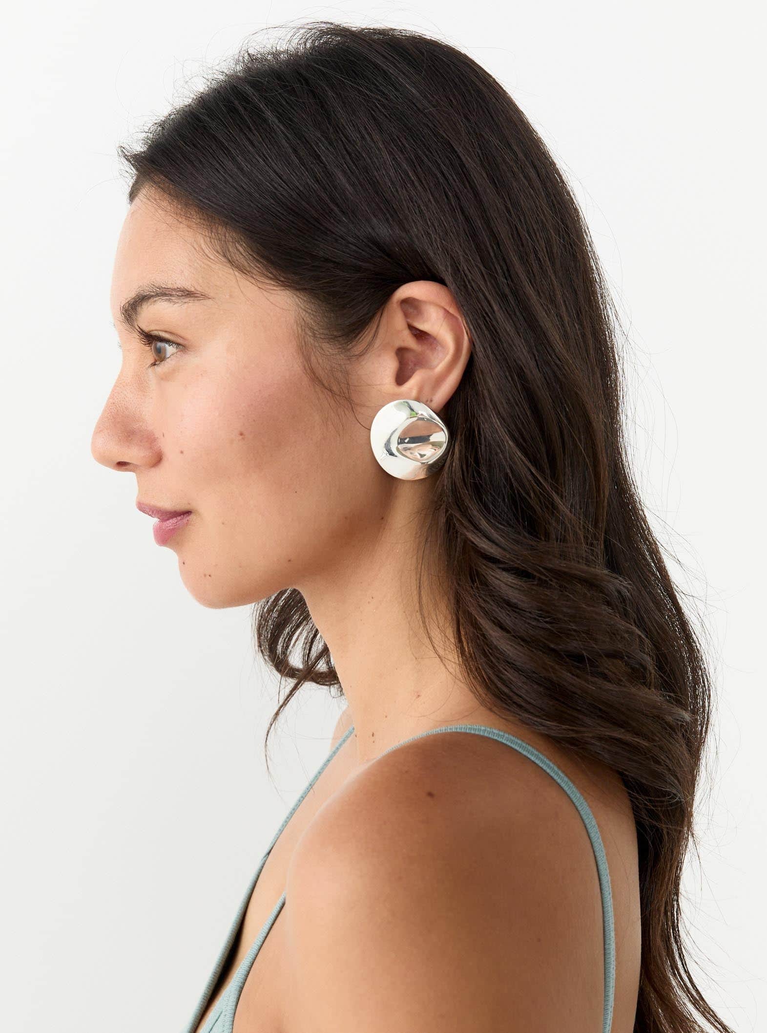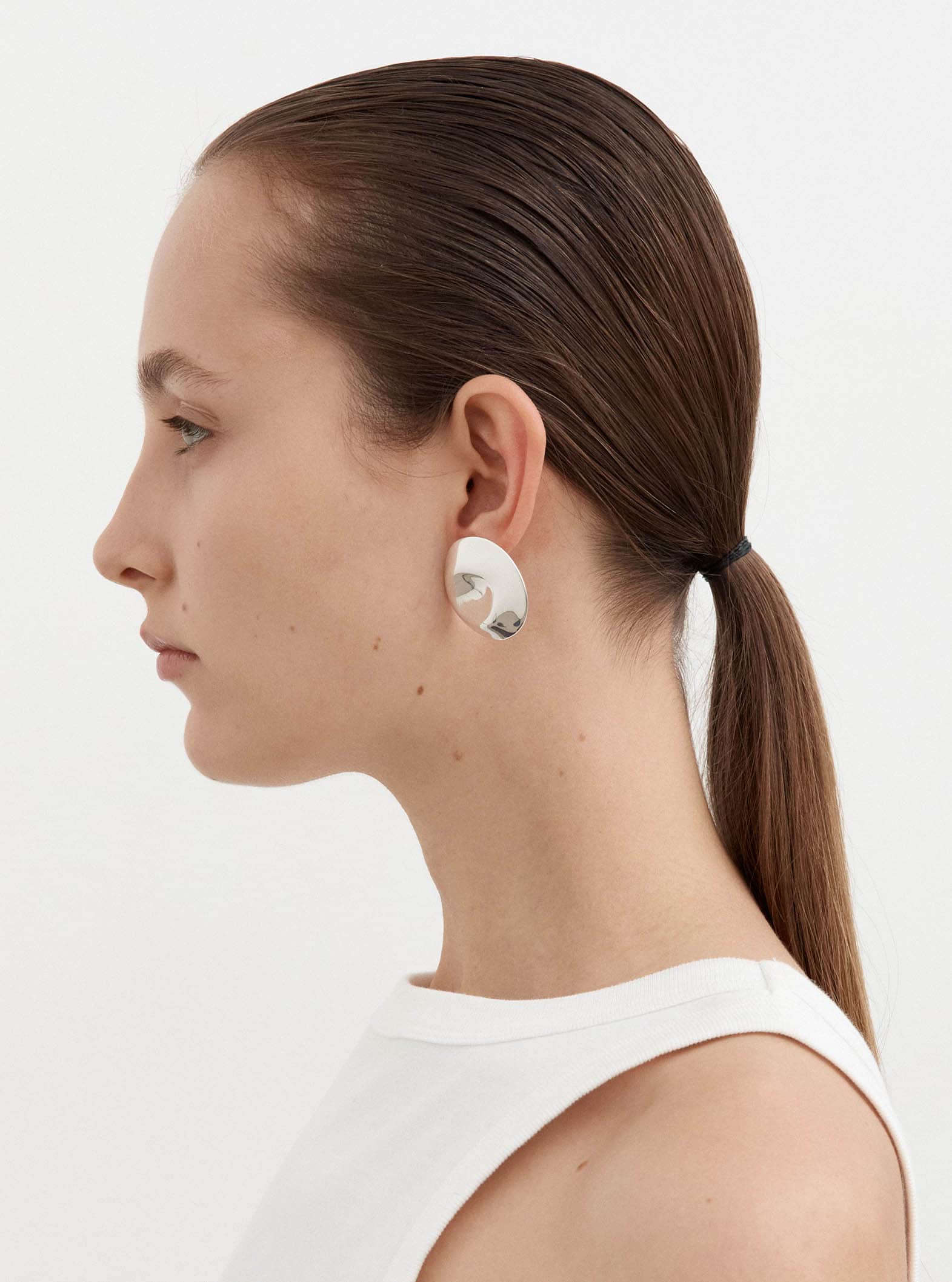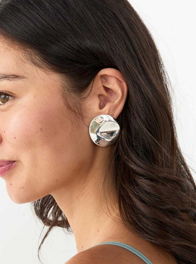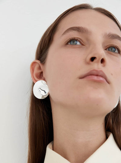 A lightweight statement earring with deliberate dented imperfection. Mirror Finish. Wear on any occasion—or casually with jeans and a t-shirt.