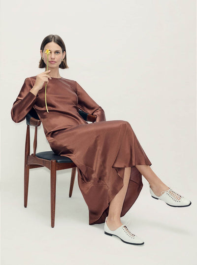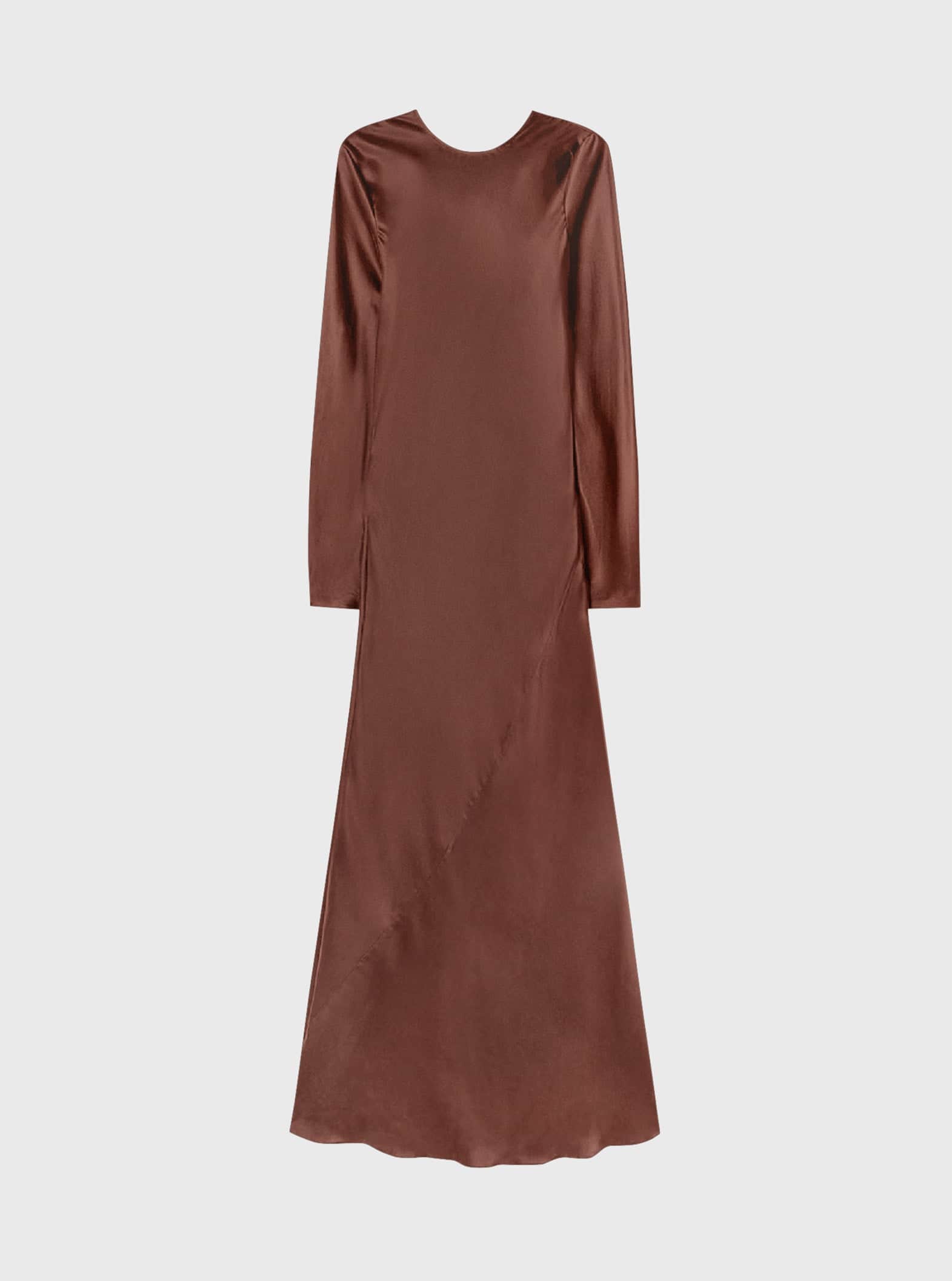 The Full Sleeve Bias Dress is cut from 100% sandwashed silk cloth. Featuring long sleeves and a round back neckline. Cut on the bias with an ankle length hemline.