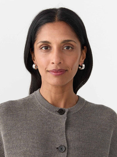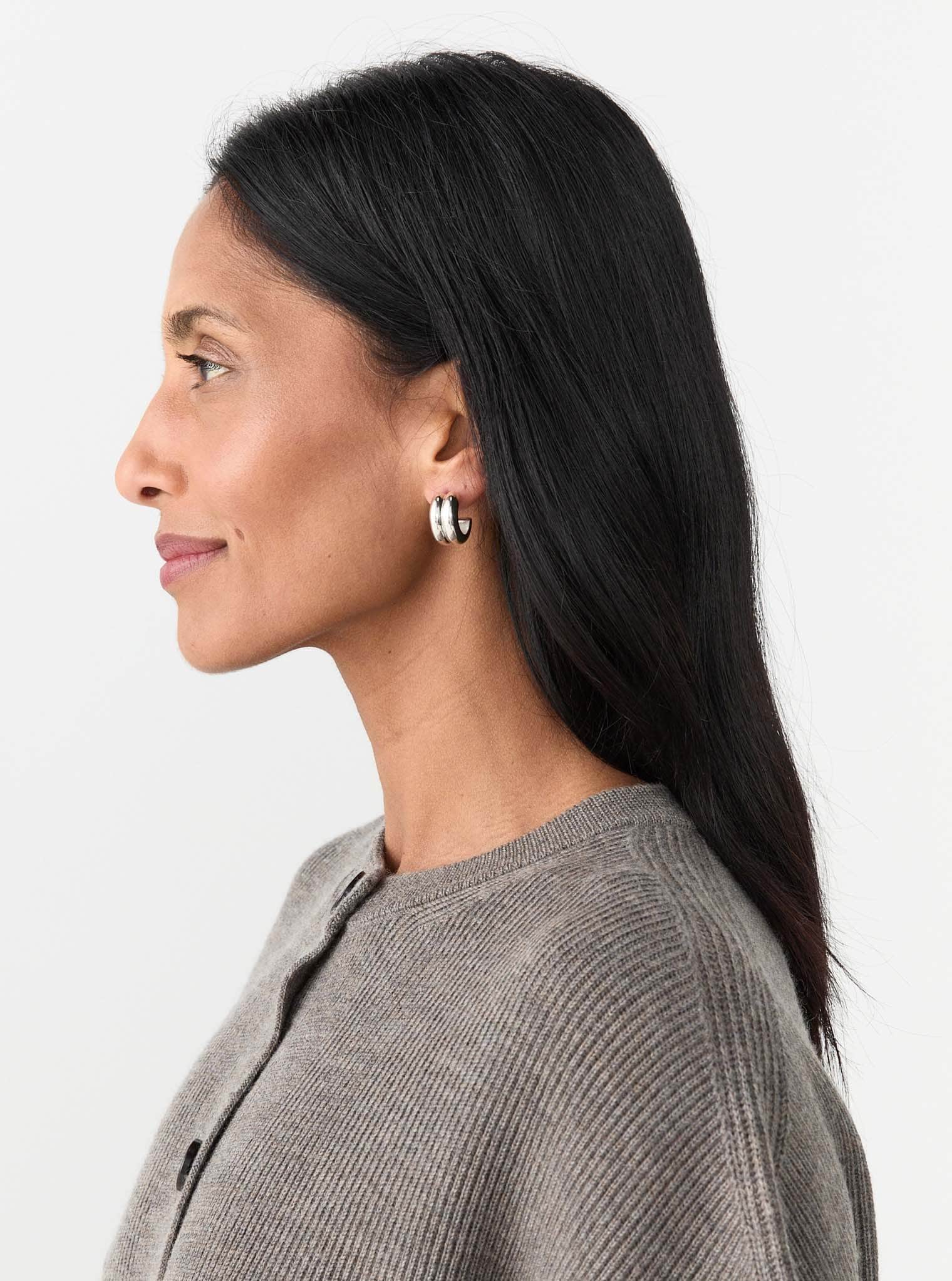 The Giulia Hoops by AGMES are sculptural, modern huggie earrings that blend boldness with everyday wearability. Hand-crafted from recycled sterling silver or 18k gold vermeil, these hoops feature a double-ridged design that adds depth and texture to the minimalist silhouette. The Giulia Hoops offer a substantial presence without overwhelming the ear, making them ideal for both daytime and evening wear.
