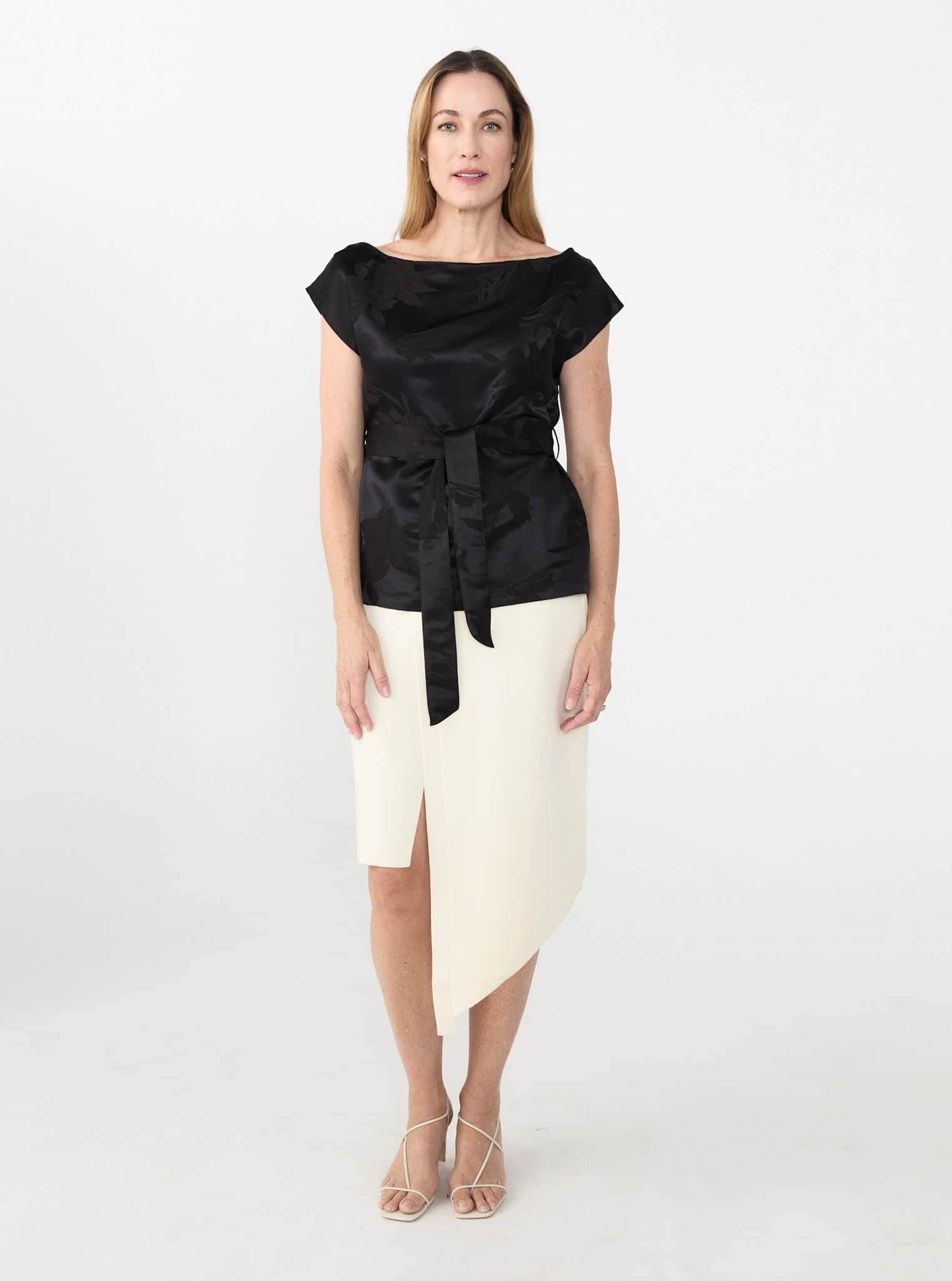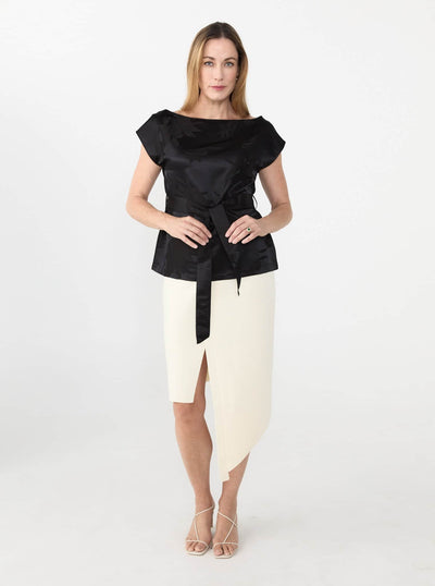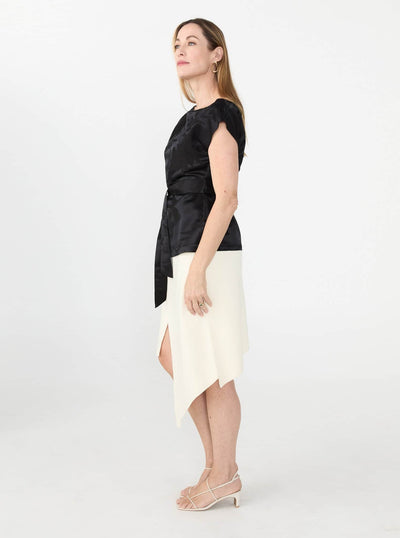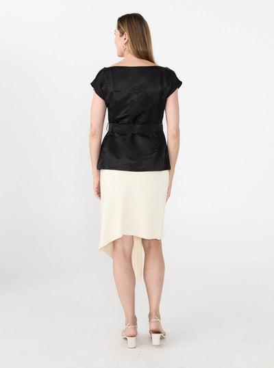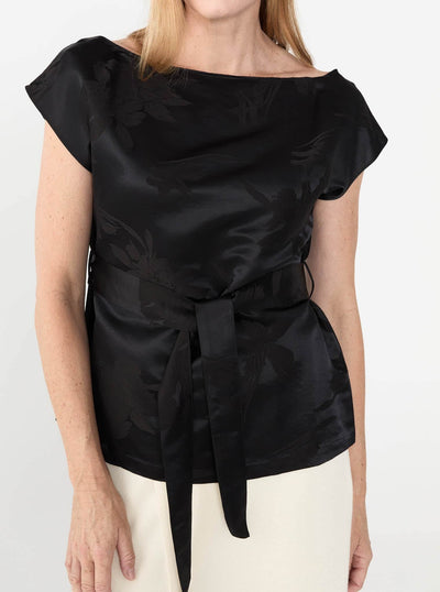 The Jude Top is crafted in a lustrous jacquard with a floral motif woven into the fabric. Designed to drape asymmetrically across the body, it falls off one shoulder and is cinched softly at the waist with a matching self-tie.