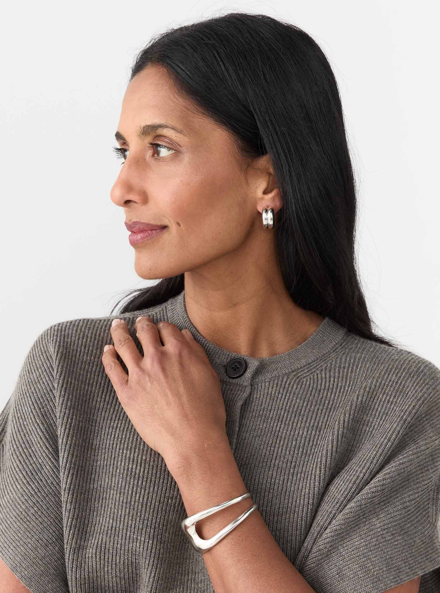 The Leona Cuff by AGMES evokes modernist elegance through sculptural simplicity. Available in Sterling Silver or plated 18k Gold Vermeil, this open cuff is distinguished by its undulating curves and mirror-like polish.