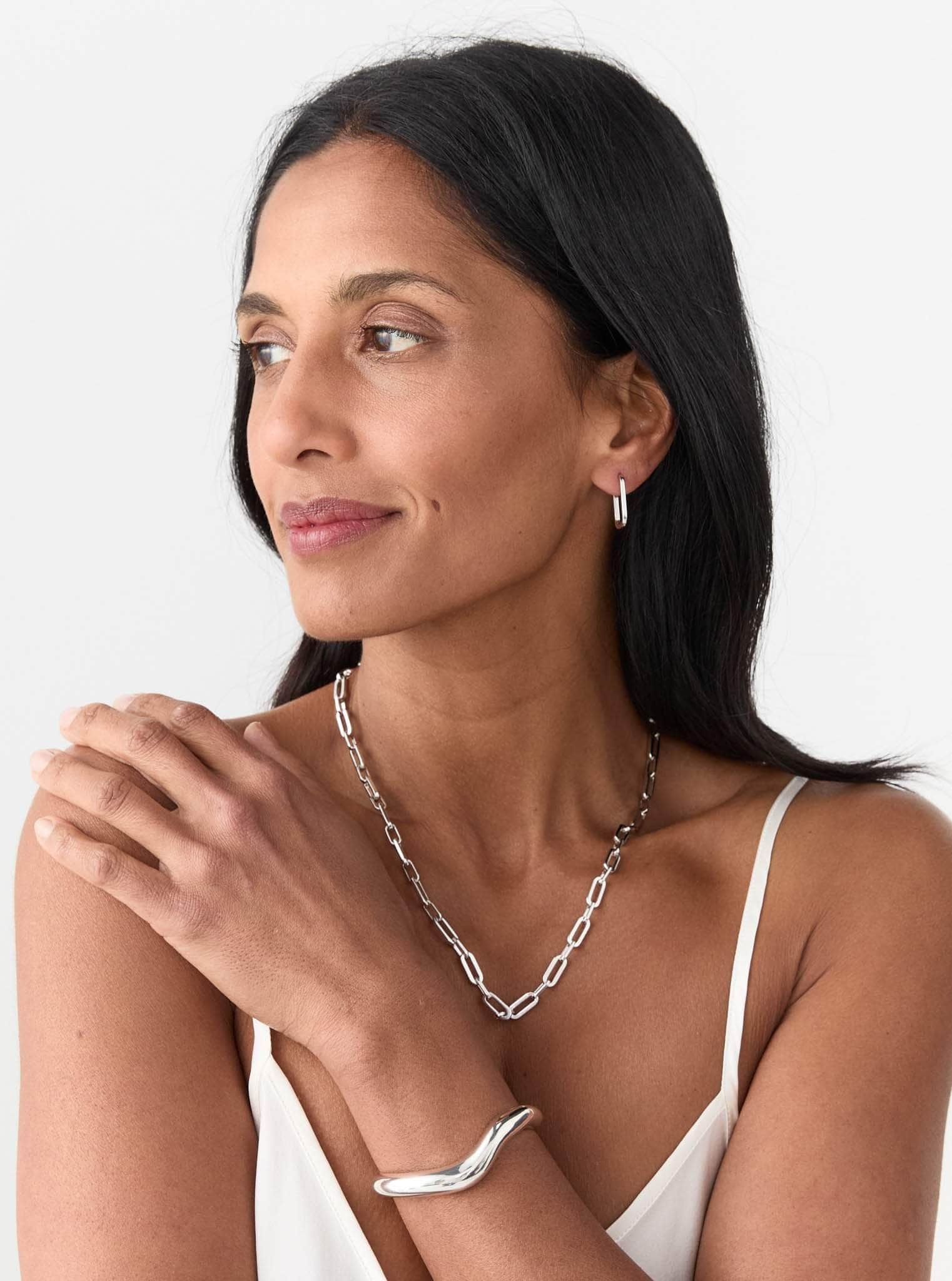 A sculptural yet streamlined open cuff, the Medium Astrid captures Agmes’ signature aesthetic and is available in luxurious .925 sterling silver or 18k gold vermeil over recycled silver.