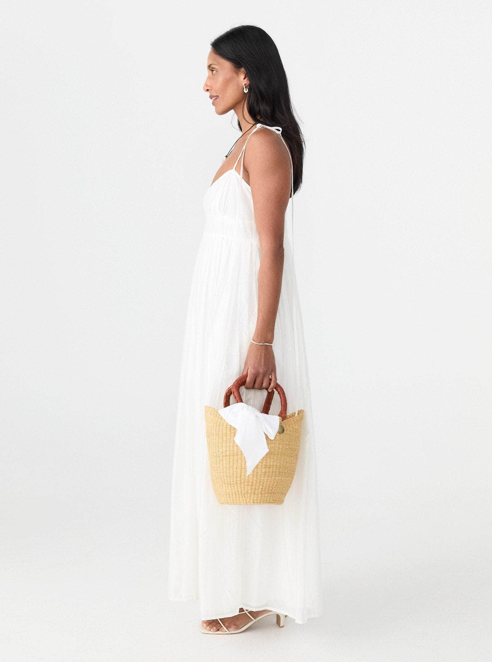 The Mini Basket Bag perfectly marries form and function. Handwoven by skilled artisans in Ghana, it's made from carefully threaded elephant grass that is both beautiful and structurally strong. The compact silhouette is decorated with thickly-woven leather handles and a removable bow embellishment. It's finished with the brand's emblem.