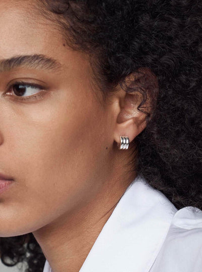 The Mini Triple Ridge Hoops by AGMES are a sculptural take on a classic hoop. These mini earrings feature three softly contoured bands crafted from recycled metals, they are available in both sterling silver and 18k gold vermeil.