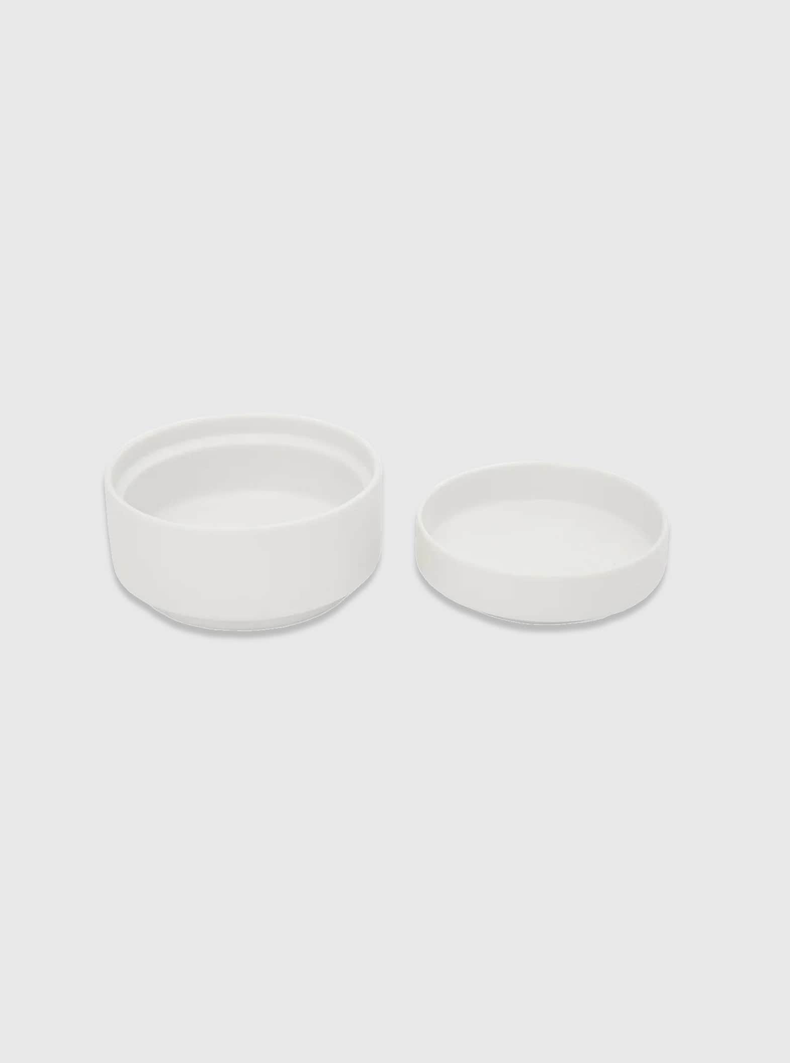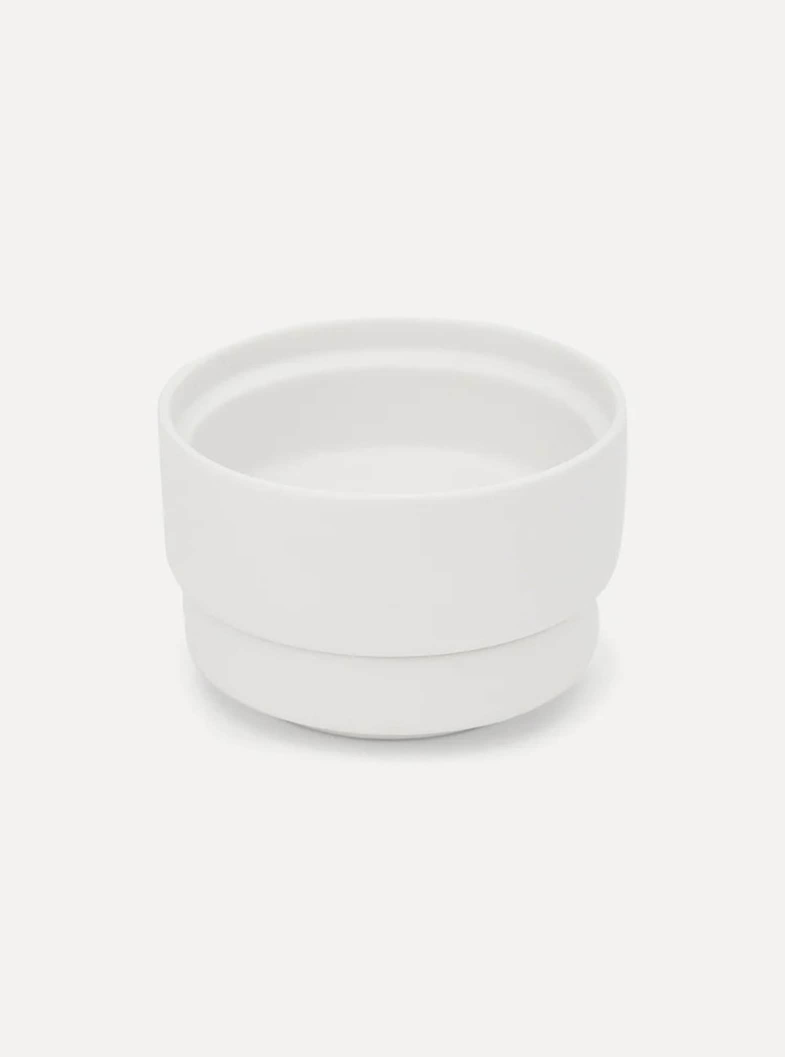 Crafted from fine porcelain and finished with a soft matte glaze, the Service Projects Olive Bowl is tailor made for olives but can also be used for dips, snacks, or even flaky and fine salts. The bowl’s stackable silhouette ensures it tucks neatly away in your cabinet.