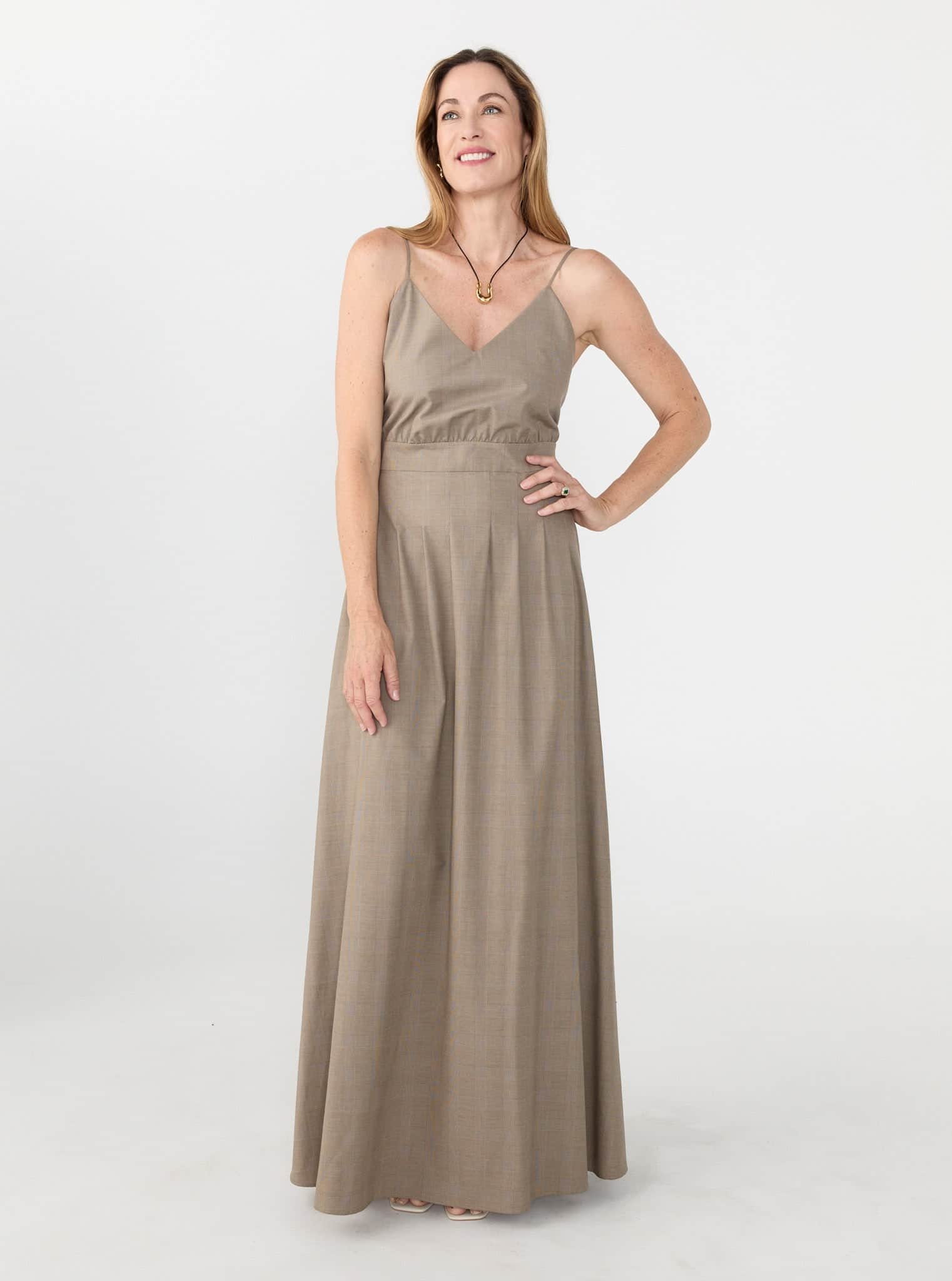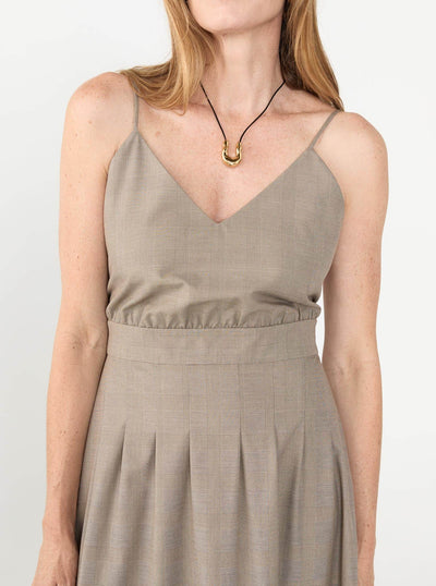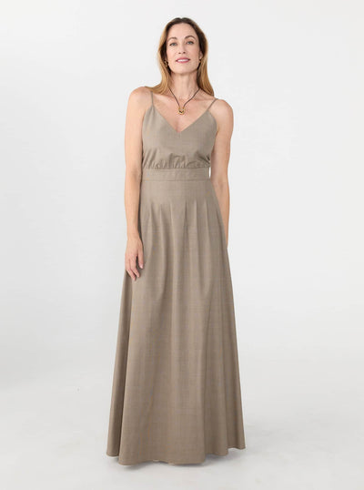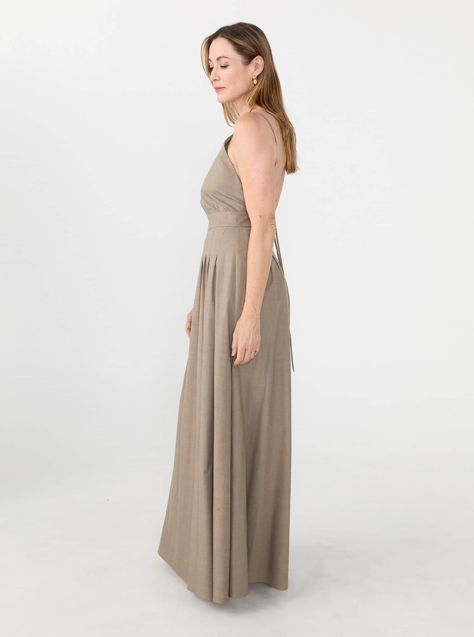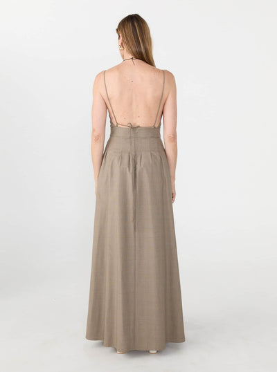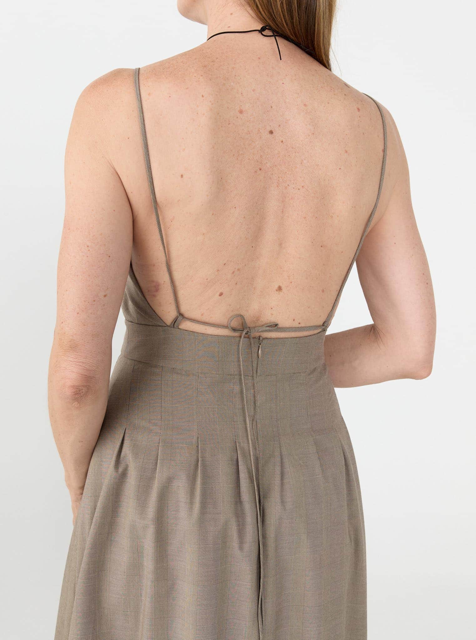 The Ortona Open Back Dress by Matin features a fitted bodice with an adjustable bust for subtle shape, while the pleated skirt drapes gracefully for fluid movement. Its striking open-back design, highlighted by fine, crisscross straps that add a touch of understated allure.