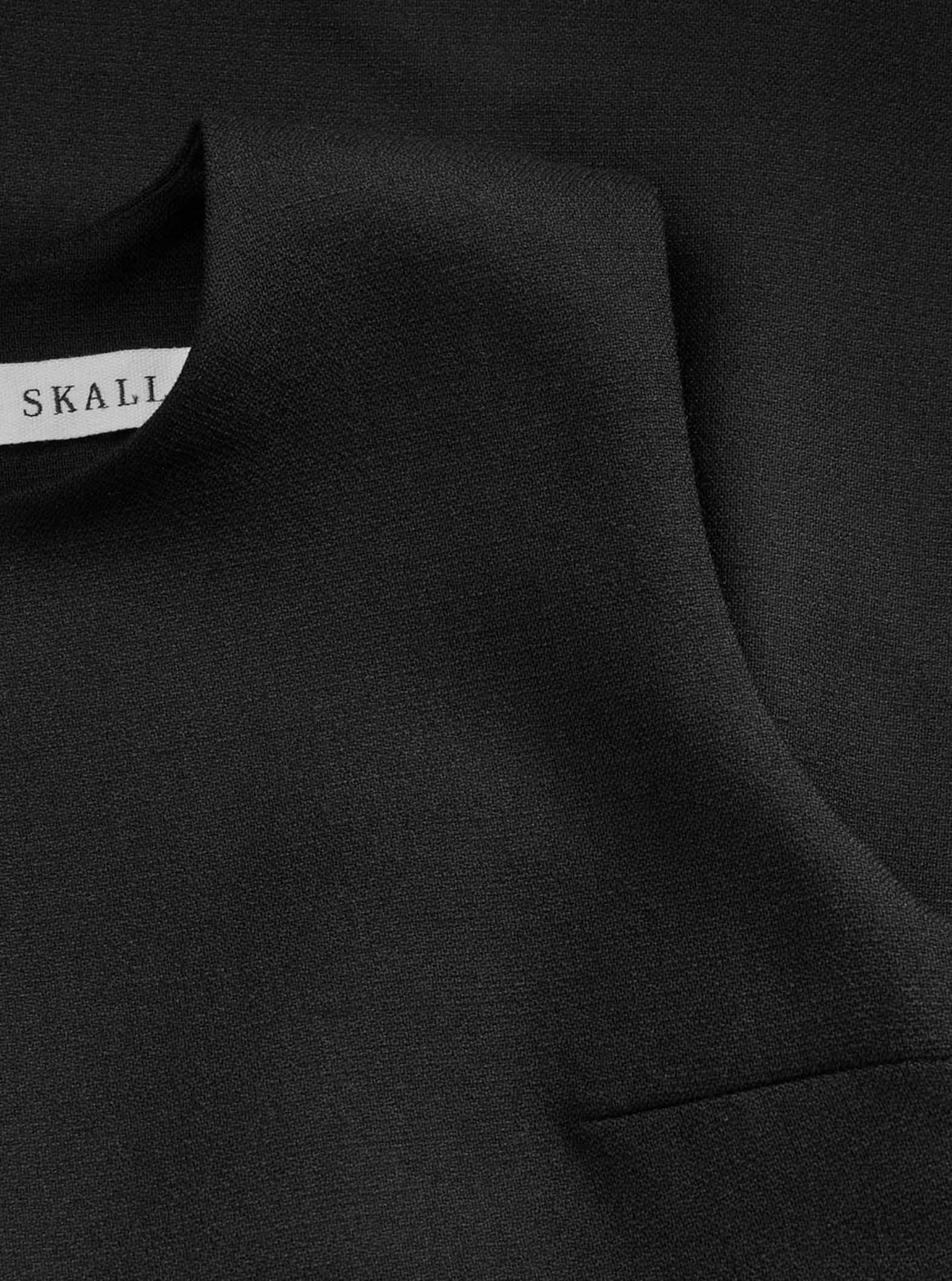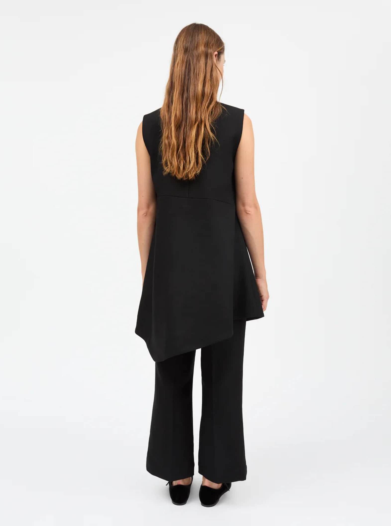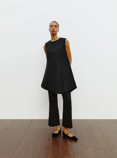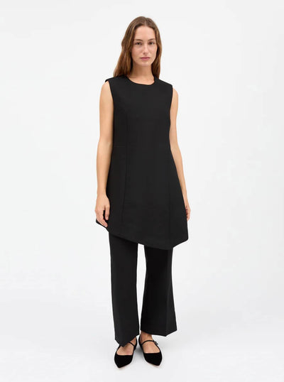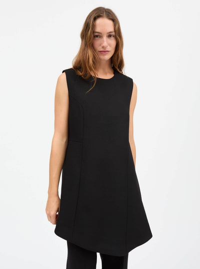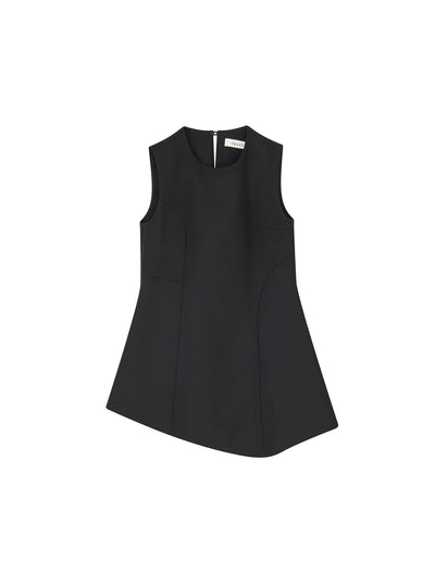 The Phillippina Dress is a short sleeveless dress with an asymmetrical hem and seams. Flaring out from a simple round neckline, the dress has a seam at the waist and fastens at the back neck with a hook and eye.