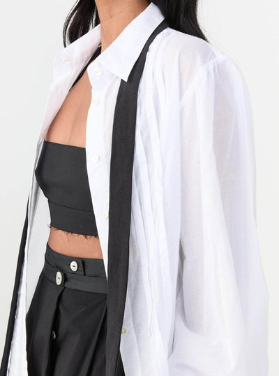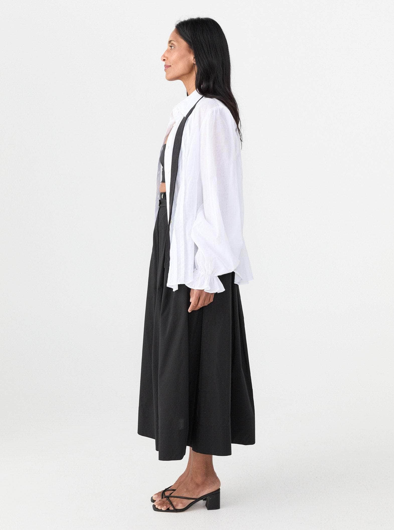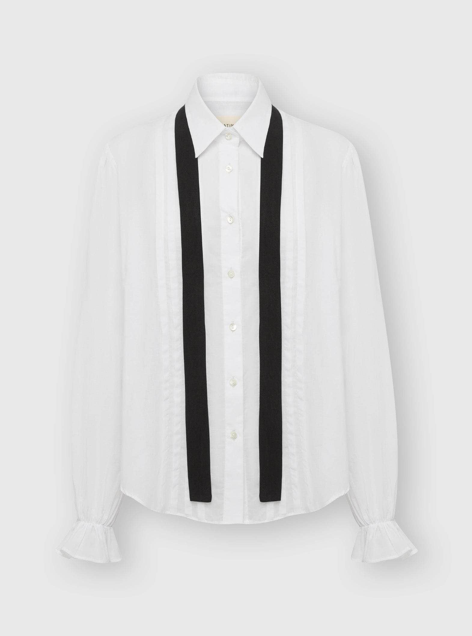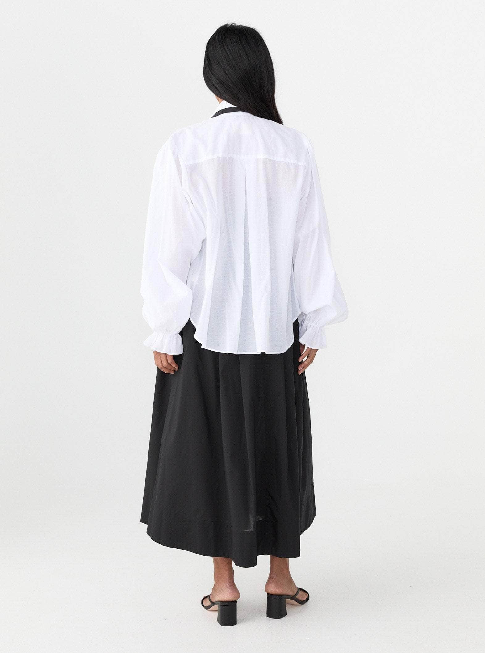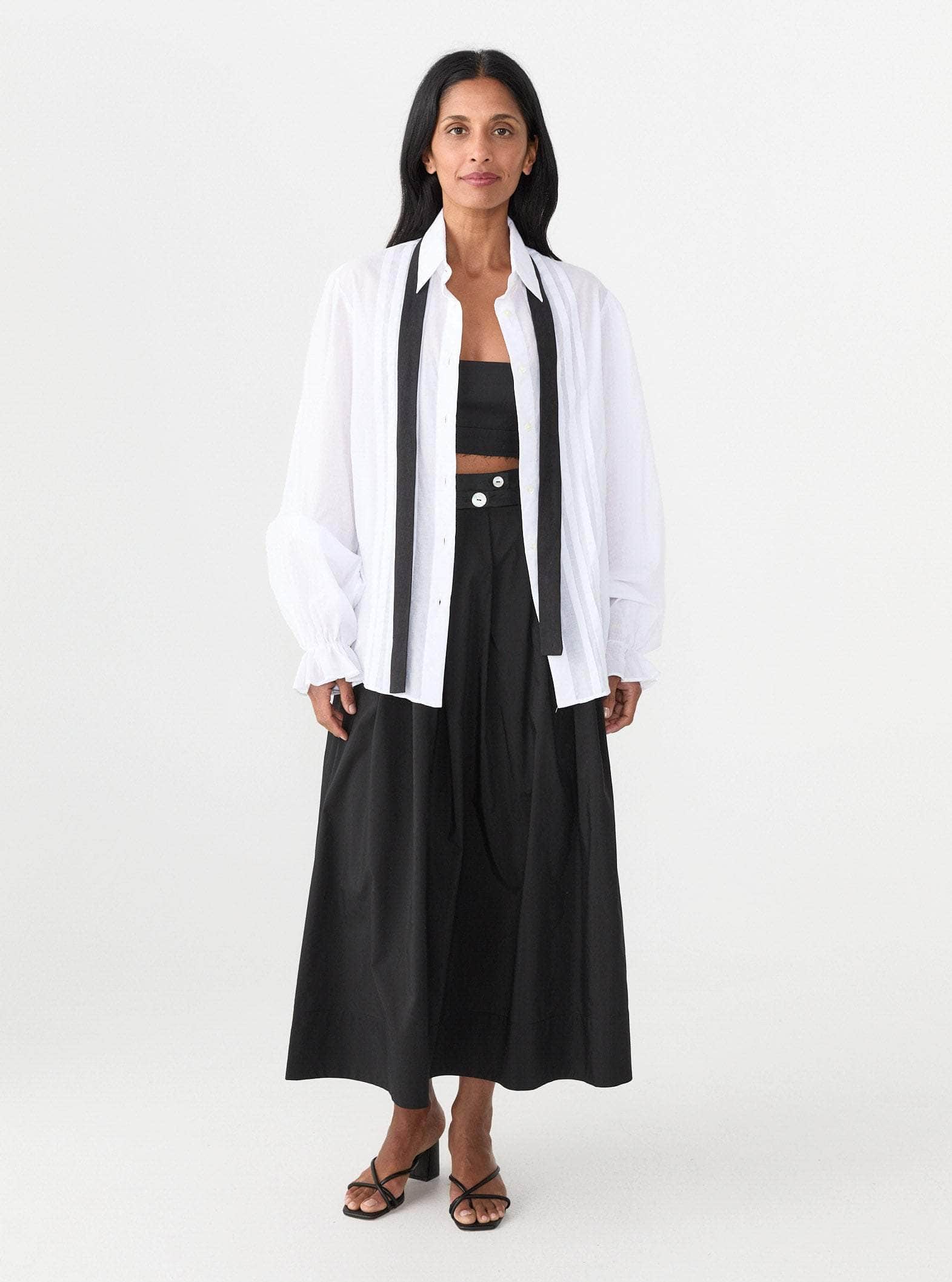 The Pintuck Shirt is crafted from lightweight cotton voile, featuring fine pintuck detailing and gently gathered cuffs. A removable silk, linen blend tie at the collar adds styling versatility—wear it loose, in a bow, or without for a clean silhouette.