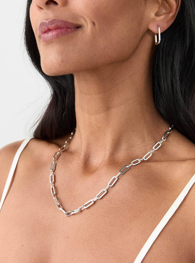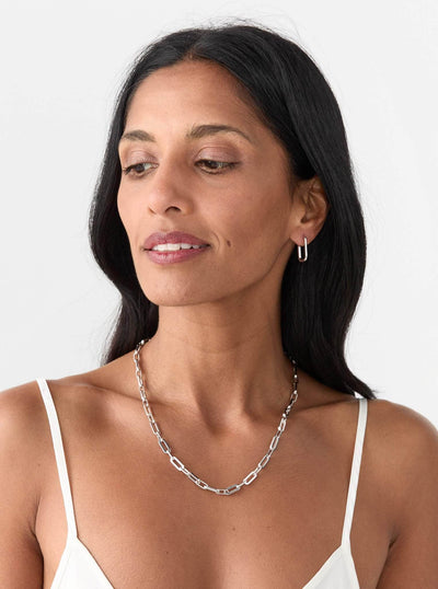 The Suitor Chain Necklace in recycled Sterling Silver has long rectangular links with rounded corners and faceted edges. A well-crafted chain with just the right amount of presence.