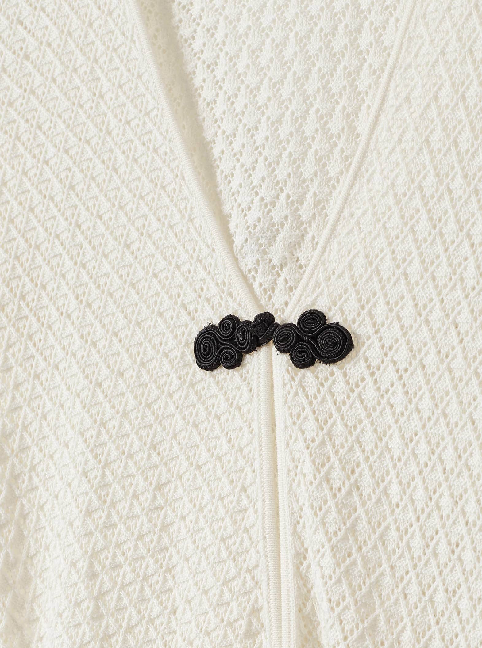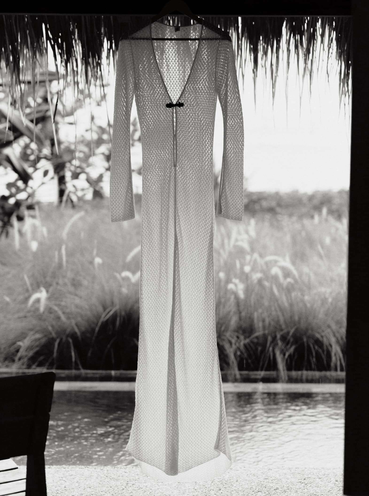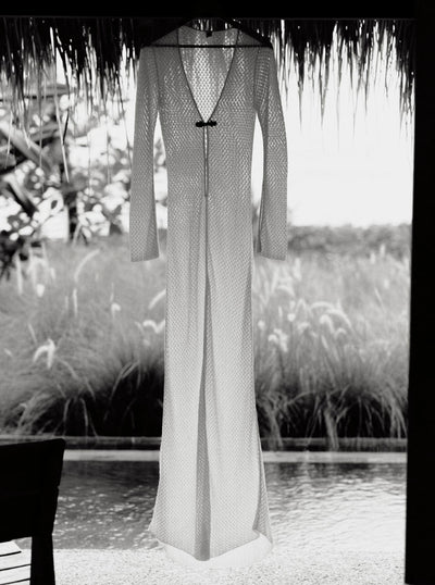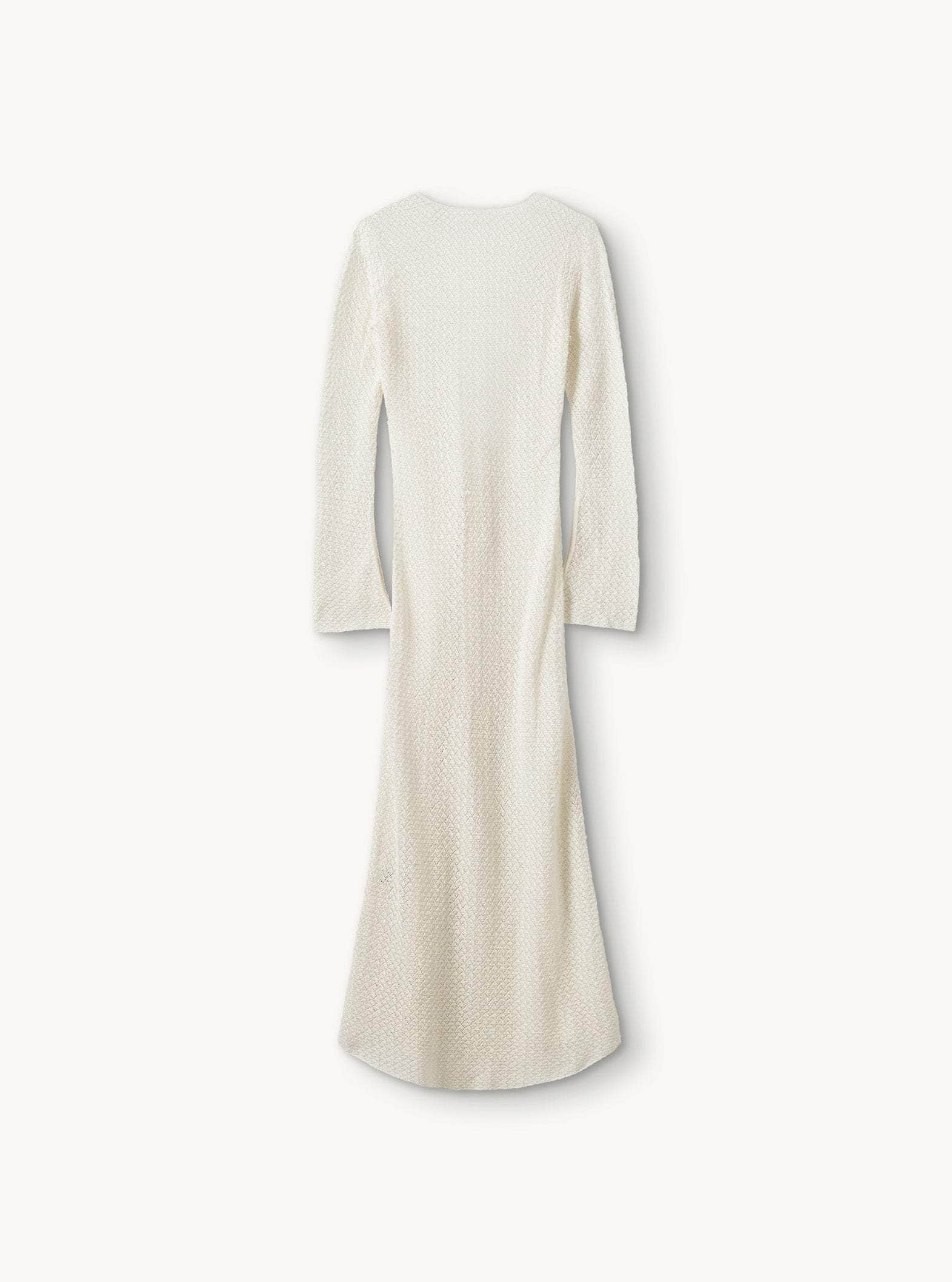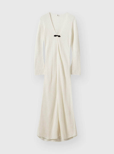 The Tanzania Dress by The Garment combines elegance and comfort. Crafted from 100% organic cotton, this pointelle-knitted long dress offers a relaxed fit that gracefully contours the body. Key design elements include a front slit for ease of movement, distinctive buckle details, and long sleeves with slits running up each side, adding a touch of modern sophistication.