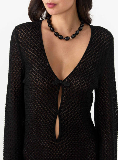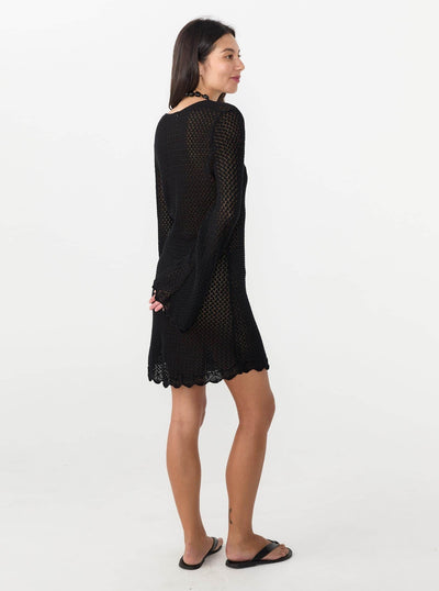 The Tanzania Short Dress by The Garment is crafted from 100% Organic Cotton, in a pointelle-knit. The dress features a neckline with a subtle tie detail, gently flared bell sleeves and a scalloped hem.